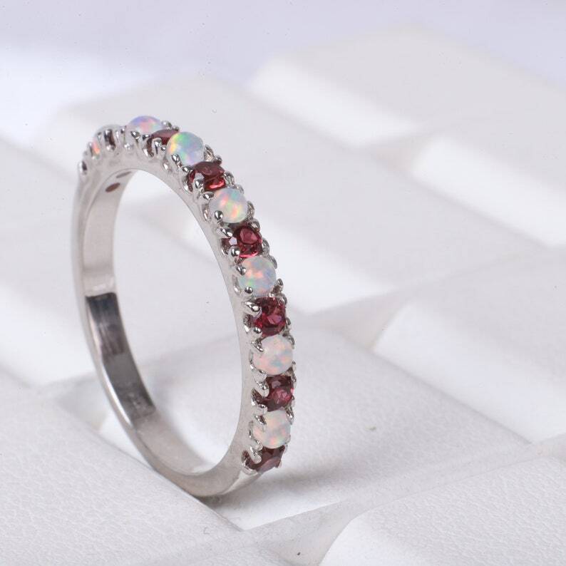 Natural Garnet & Ethiopian Opal Half Band Ring Beautiful Engagement Ring & The Stone Are 2.50 MM And Multicolor Stone Genuine & Certified Ethiopian Opal Ring If Any Customer Want Custom design I made Custom Order Also Product: Ring Gemstone: Natural Garnet & Ethiopian Opal Weight : under 50 Carat Dimension: All Size are Available Color: Same In Image Treatments: Natural Measurements and Weight Are Close to Approximation Select Your Ring Size All Is (US)👇 Size And Wirte In The Personlazition 2 2.25 2.5 2.75 3 3.5 3.25 3.75 4 4.5 4.25 4.75 5 5.5 5.25 5.75 6 6.5 6.25 6.75 7 7.5 7.25 7.75 8 8.5 8.25 8.75 9 9.5 9.25 9.75 10 10.5 10.75 11 11.25 12 12.5 RETURN POLICY Your satisfaction is of the utmost concern to us. Should you need to return an item, you can do so within 30 days of receipt of the item for a full refund. Return shipping charges are not reimbursable. All items must be in their original condition, not worn or altered. Please contact us if you would like to initiate a return, so that we may guide you through the process. We can be reached through the "Ask a Question" link on the listings. FEEDBACK We strive for 100% Customer Satisfaction and we always leave positive feed backs to our buyers. Please help us maintain our business and give a 5-Star rating .If you still think that you still can’t leave a 5-Star across the Board, please email us or call us and we assure you that your issue will be resolved immediately. We believe in solving the issues. A positive feedback represents our service,product quality and dedication towards customer's satisfaction. Our future business depends on your satisfaction or positive feedback with "5-star rating". Abut As :- We are manufacturer exporter of loose gemstone from Jaipur Rajasthan . We are doing the business from last 40 years . We can provide any type of stone at desired shape and size. Contact As :- Please write us for any question we are ready to give answer 24 X 7. Thank you
