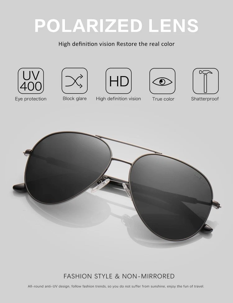 CARE: To avoid damage, never clean your Polarized Aviator Sunglasses with paper towels or clothing, and also avoid using household detergents or soaps. Fun fact: Don't keep any sunglasses in the car during the summer, as the heat will damage the lenses. 100% UVA/UVB Protection 100% Polarized lens that filter, balance and enhance the colors that our eyes naturally perceives and promise you a better clarity of [Natural Vision]. Light Weight High Quality Metal for Superior comfort wearing experience. POLARIZED LENS ▶ 100% UV400 eye protection effectively filter & block glares Designed for driving & outdoor activities High-definition lens gives you a natural & clear vision Durable & Shatterproof ANTIOXIDANT PLATING FRAME ▶ Antioxidant plating Anti-allergy & skin-friendly tested Harmless to skin LIGHT-WEIGHT ARM ▶ Light-weighted & elastic arm Stress-free wearing experience SKIN-FRIENDLY NOSE PADS ▶ Environmental & skin-friendly materials Enables you a long-time wearing without fatigue 100% SATISFACTION GUARANTEED ▶ First Choice as A Gift Unisex Aviator Style Good for Driving & All Out Door Activities for all Day Limited Time Special Pricing and Elegant Glasses Accessories for Free CONTACT US: For any problems during the transaction, e.g. you not receive the item on time, the item with issues, etc. Pls contact us first, we promise to give you a satisfactory solution, rather than leaving neutral or negative feedback without contacting. Many thanks!
