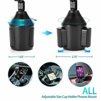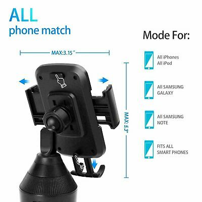 Universal 360° Adjustable Phone Mount Car Cup Holder Stand Cradle For Cell Phone Access your phone’s functions and features in the car Improve convenience by having your phone where you need Transform your phone into a GPS with ease Improve road safety and keep your eyes on the road Rotate the phone between a horizontal and vertical setting Adjust your phone to the perfect angle through the smart design Universal phone mount can hold most smartphones Perfect for devices like Apple iPhone 11, 11 Pro, 11 Pro Max, XS Max, XS, XR / Samsung Galaxy S10+, S10, Note 10 / Google Pixel 3 XL and much more Can hold devices up to 3.65” wide Smart release button makes installing and removing your device easier Install this holder in the cup holders of your car Adjustable base can expand and contract to fit an assortment of different sized cup holders Base diameter of 2.16” – 3.54” (Approx.) Approx. Neck Length: 1.77" Non-slip grips around the holder will ensure the holder does not move around Sleek design will look great in the cabin of your car