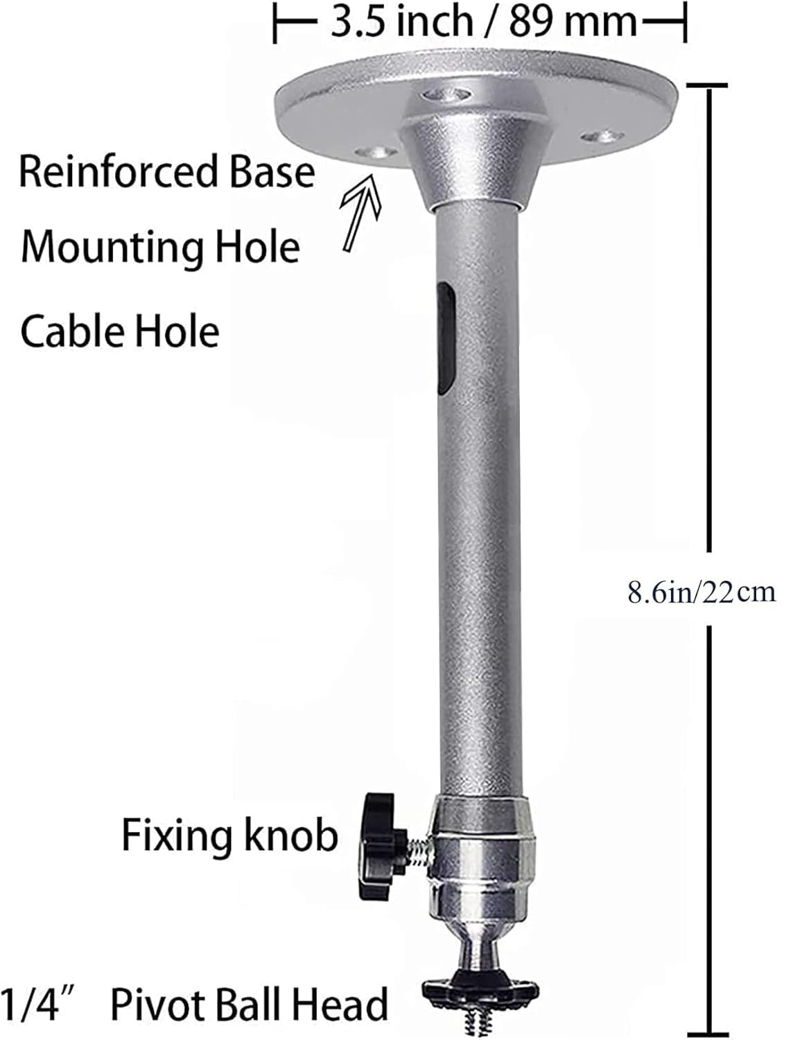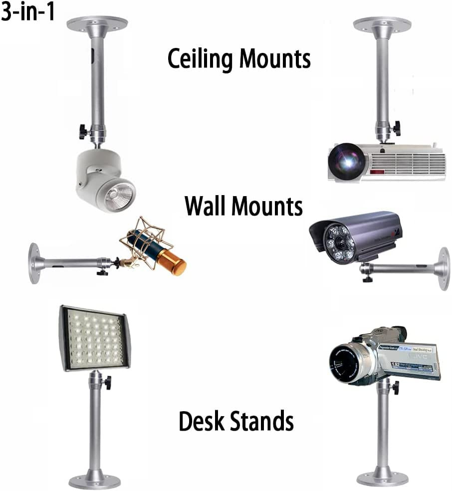 1. Angle adjustable projector mount can be rotated 360 degrees and tilt 180 degrees with a knob to fix the angle easily.The length of projector holder is 8.6in/22cm. 2.Projector wall mount is made of high-quality aluminium alloy. The tube is designed to be thicker. It is suitable for mini projector and camera. The actual maximum carrying capacity is 11 lbs/5 kg. 3. The installation of mini projector mount is easy. We are equipped with screw and screw hole filler and other accessories. You can install them on the ceiling or on the wall. (pls tighten all parts, screw in solid spot, use toggle bolts for drywall.) 4. Universal projector mount pole has three different sizes of screw connectors to achieve maximum compatibility. Applicable to office, home or classroom multi-functional projector, closed-circuit television, digital video recorder, camera, tracking camera, CCTV, LED lamp holder, etc. Attached M4 and M6 conversion screws, cost-effective! 5. Projector ceiling mount has Please tell us about any problem! We will try our best to serve our dear customers!