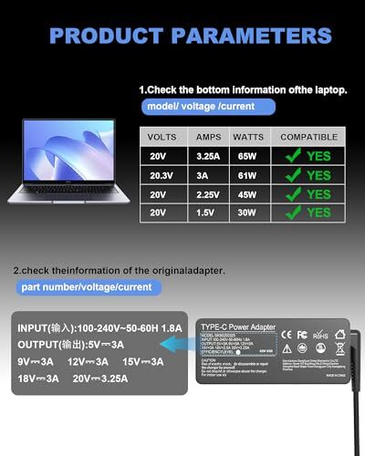 Power Specs - Output Max: 65w ~ 20v 3.25a Compatible 45W~ 20v 2.25a/and Less Than 65W Input Volt Range: 110-240v Wattage: 65w Max;Plug Type: USB C Type C Port; Condition: 100% New.This 65w 45w USB-C Charger Universal Replacement For Lenovo HP Acer Sumsang Asus Chromebook Series,Dell Xps 13 Series And More.... Compatible With Lenovo Chromebook 100e 300e 500e c330 c340 s330 s340 c630 Yoga; ThinkPad A275 A285 A475 A485 T470 T470s T480 T480s T570 T580 T580s T490 T590 T495 E480 E580 E485 E585 E490 E590 L480 L580 X270 X280 X380 X390 X395 X1 Carbon 5th 6th 7th Generation, X1 Yoga (2nd 3rd Gen); Flex 11 Chromebook; ThinkPad 13 (1st 2nd); Tablet 10, ThinkPad X1 Tablet 2nd 3rd; Yoga 720 720s (13" ONLY!) 730s; Yoga 370 910 920 S730 C930 720-12IKB 720S-13IKB 730-13IKB 910-13IKB 920-13IKB Compatible With HP Chromebook X360 14-CA 14C-CA 14A-NA 14B-CA 11-AE 11A-NB 14-DA 15-DB /Google Chromebook 11 G1 G2:14a-na0010nr 11a-na0021nr 14a-na0020nr na0035nr na0060nr na0022od 14b-ca0010nr 14b-ca0013dx 11a-nb0013dx 14b-ca0015cl 14b-ca0023dx 14b-ca0025cl 14b-ca0036nr 14c-ca0000 14-ca0043cl 14-ca003cl ca0053dx ca051nr ca0065nr15-DE0000 15-DE0523DX 14-ca061dx;HP Spectre X2 X360;Elite X2,Pavilion X2,Pro 2 :HP Pro x2 612 G2 table;HP Chromebook x360 11 G1 EE;HP Pavilion X2 12-B 10-N10-P And More Compatible with DELL Latitude 3400 3410 3500 3510 7310 7275 7320 7370 3310 2-in-1 3390 2-in-1 5175 2-in-1 5285 2-in-1 5289 2-in-1 5290 2-in-1 5320 2-in-1 7200 2-in-1 7210 2-in-1 7285 2-in-1 7390 2-in-1 Chromebook 3100 3380 3400 5190 5190 2-in-1 XPS 12 9250 XPS 13 9300 9310 9350 9360 9370 9380/7390 9310 9365-2in1 XPS 15 9550. Compatible With Acer Chromebook Spin :11 13 15 311 315 R13 CP311 CP713 C933 CB5-312T N17Q5 N17P6 N16Q10 N16Q14 N16Q12 N18Q1 N15Q13 CB311 CB311-8H CB311-8H-C5DV CB311-9H CB311-9HT CB314 CB314-1H CB314-1H-C34N CB314-1H-C884 CB315 CB315-1H CB315-1HT CB315-1HT-C4RY CB315-1HT-C9UA CB315-2H CB315-2HT CP311 CP311-1H CP311-2H CP311-2H-C679 CP311-2H-C3KA C721 C732 C733 C771 C851 C933 C721 C732 C732L C732T Compatible with Asus Chromebook C302 C302C C302CA C101 C101P C101PA C213SA C213S C213 C523NA C523N C523,C214MA C214M C223NA C223N C423NA C423N C204MA C204M,C434 Q325 Q325U Q325UA And more Compatible with Samsung Chromebook 4 XE310XBA-K01US K02US K03US,Chromebook 4 Plus + XE350XBA-K01US, XE310XBA XE350XBA Plus Pro XE513C24 XE510C24 V2 XE520QAB XE521QAB XE525QBB W16-030N1A PA-1300-87 Samsung Galaxy Book2 12 W737/Samsung Galaxy Book 12 W720N W727V/Samsung Galaxy Book 10.6 W620N/Samsung Galaxy TabPro S W700N Samsung Galaxy Book Flex 2-in-1 And More 【Our Guarantee】 12 Months Warranty, 24 x 7 Email Support, 30 Days Money Back. Any problem, please Contact us through Amazon.