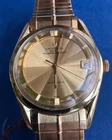 Universal Geneve Polerouter Date with microrotor automatic inhouse manufacture movement made in switzerland, 1960s with patented case design goldplated case and bracelet (NOS) with monogram on buckle (very rare), and special brand dial (NOS) for Polerouter models in Gold color Guilloche finish with ring on side with marking for hour marks. Generic Plexiglass. “UNIQUE PIECE” Most iconic swiss watch of 1960 designed by most famous swiss watch designe Mr. Geral Genta and with the first microrotor automatic movement in world. The brand Universal Geneve is being revived as a classic luxury Brand after being purchased by Breitling watches, Switzerland NOTE: The case back due to age and use over many years has scratches and wear out (see pics) Dial and hands have light patina FULLY INSURED SHIPPING