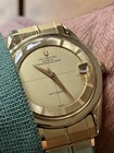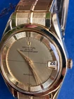 Universal Geneve Polerouter date with microrotor automatic inhouse manufacture movement made in switzerland, 1960s with patented case design goldplated case and bracelet with monogram on buckle (very rare), and special brand dial in Champagne color for Polerouter models with ring on side with marking for hour marks. Original Plexiglass with date magnifier. Most iconic swiss watch of 1960 designed by most famous swiss watch designe Mr. Geral Genta and with the first microrotor automatic movement in world. The Universal Geneve Brand is being revived as luxury classic brand after being recently being purchased by Breitling watches Switzerland Note: The Case back has scratches and due to polishing overtime slightly wornout. Dial & hands have slight patina due to age of watch. Pls check pictures FULLY INSURED SHIPPING