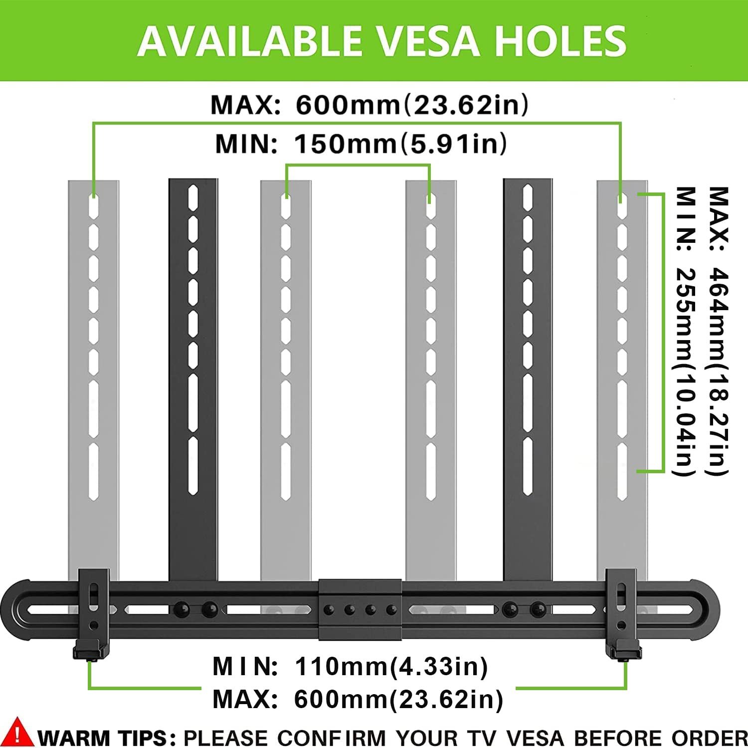 Soundbar Wall Mount Compatibility: This Soundbar bracket is suitable for most TV’s distance on Horizontal Max 600mm and Min 150mm and Max 13 LBS loading capacity. Also, fits most TVs up to 600x400mm and it is compatible with most fixed, tilt, full motion TV mount or TV stand, and the soundbar bracket allows the sound bar to move with the TV. Adjustable Holders: With extendable & adjustable holders, extends to 6.06'' and retracts back to 3.46'', this soundbar mount is Suitable for sound bars in different widths. Installation Options: All included hardwares are in pre-labeled bags. --- THREE steps:1. Check the TV VESA hole pattern, attach brackets to wall plate. 2 . Attach the soundbar brackets to the TV brackets (tips:In this step, only lock one screw on each side.) 3 . Attach and lock base holders. (Remarks can help you distinguish which screw you should use). For the better and safer user experience, please follow the instruction to install the product. Warm Tips: please check the TV VESA first to make sure there is enough space from the bottom of the TV to the sound bar bracket base to accommodate your sound bar. Good Quality & Service Anywhere Anytime: ANY ISSUES/ PROBLEM, PLS LET’S KNOW, WILL SOLVE IT FIRST! Our product is producted by a professional TV mount factory with over 20 years’ experience. All TV mounts are designed elegantly and produced via lots of advanced automatic machines such as robot welding, etc. All of them are designed and tested as international safety standard in order that they are delivered in good quality. Providing 10-year US-based customer service.