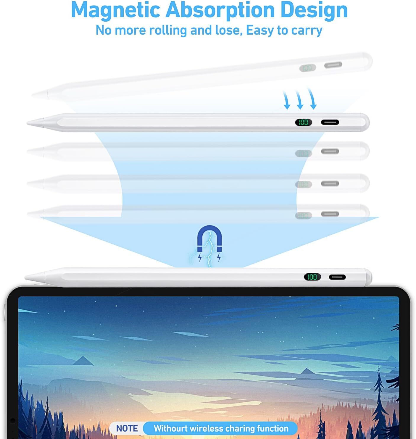 Description: 【Compatible with iPad 2018-2022】 The Pen for ipad supports for Apple iPad 2018 releases and later, compatible with iPad 9.7" and 10.2" (6/7/8/9/10 gen), iPad Air (3/4/5 gen), iPad Mini (5/6 gen), iPad Pro 11" (1/2/3/4 gen) and 12.9"(3/4/5/6 gen). Does not compatible with iPhone or Android Phone, Android Tablet, Microsoft devices. Please check the correct iPad model before ordering. 【Faster Charge & LED Power Indicator】 with USB-C charging port and 130mah built-in battery, it only takes 30 minutes to fully charge and work for 10 hours continuously. Automatically turn off after being idle for 10 minutes. 3 indicators design can clearly see power of the stylus pen, timely charge, and avoid automatic shutdown due to lack of power during use. No bluetooth needed. 【High Precision & Smooth】 The stylus for ipad is equipped with a 1.5mm POM tip which is more precise and sensitive, no lagging, no skips, no scratches, no delay. Just like the original Pencil, great for take notes, sketch, mark documents and get more work done for iPad. No pressure sensitivity. Comes with 1 replacement nibs, don't worry about wear and tear. 【Palm Rejection & Magnetically Attach】 The pencil for ipad with palm rejection, you can rest your palm on the screen without an uncomfortable glove.This pen for apple can be attached to the side of the device, which allows you to easily carry and no more rolling and dropping. 【Tilt Sensitivity &Touch Activated】 Professional Sketching stylus for ipad, just tilt to adjust line thickness, perfect for sketching, drawing and marking. The tilt technology makes your writing and drawing more freedom than ever. Easy to use, double tap the top of the stylus pencil to turn on/off. Specification: Color: White Material: Metal Point Material: POM Number of Batteries: 1 Lithium Polymer batteries required. (included) Compatible Devices: Tablet Are Batteries Included:Yes Batteries Required?: No Charging Time: 60 minutes Working Time: 10 hours Control Way: Touch Size: 16.6x0.89cm Package: 1x Capacitive Pen 1x Glove 1x Pen Tip 1x Charging Cable