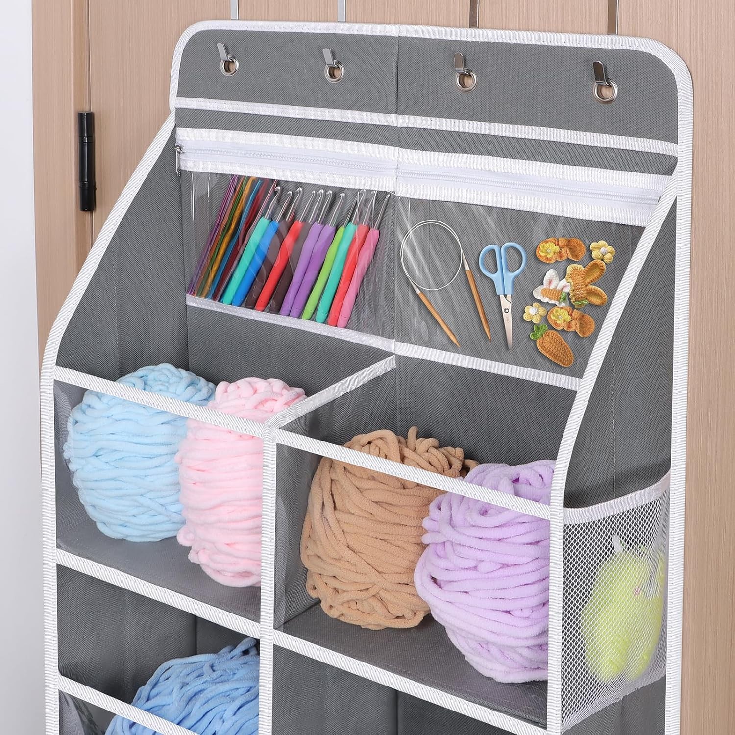 Spacious Yarn Storage Spaces: Univivi 6 Tiers yarn organizer features 20" Expanded Width. 5 Tiers designed with 10 individual sections for yarn balls. Two clear zipper pockets on the top for crochet hooks and finished project. The 10 mesh side pockets are ideal for storing accessories that need to be easy access and visible. Sturdy and Stable Design: This yarn storage organizer crafts strong stitching, reinforced bottom inserts, and fiberglass tubes to prevent sagging and leaning. Hold up to 50 LBs load capacity without tilting. Hello to organized living with our crochet organizer! Multi-functional Space-Saving Solution: Univivi yarn organizers and storage with 12 compartments is desired to anyone who want to declutter and maximize their storage space. It's suitable for apartment, dorm, panty, bathroom, bedroom, laundry, kidsroom, nursery hanging storage and organization. Premium and Reliable Materials: Our hanging yarn storage is made from breathable, durable and safty fabric, none smell. Storing your yarn, crochet accessories, household items and newborn baby essentials with 100% confidence. The clear window make you see everything inside at a glance and easy to access the things you need. Quick & Simple Installation: Put 4 supporting hooks over the door, hang the organizer into the hooks, and then insert 10 bottom cardboards. You can finish it with 3 minites without tools! The clip-on hooks fit for doors under 1.8 inch thickness. Brand Univivi Material Non-woven Fabrics and Polyvinyl Chloride Color Grey Capacity 50 Pounds Number of Items 1 Manufacturer Univivi 7072417
