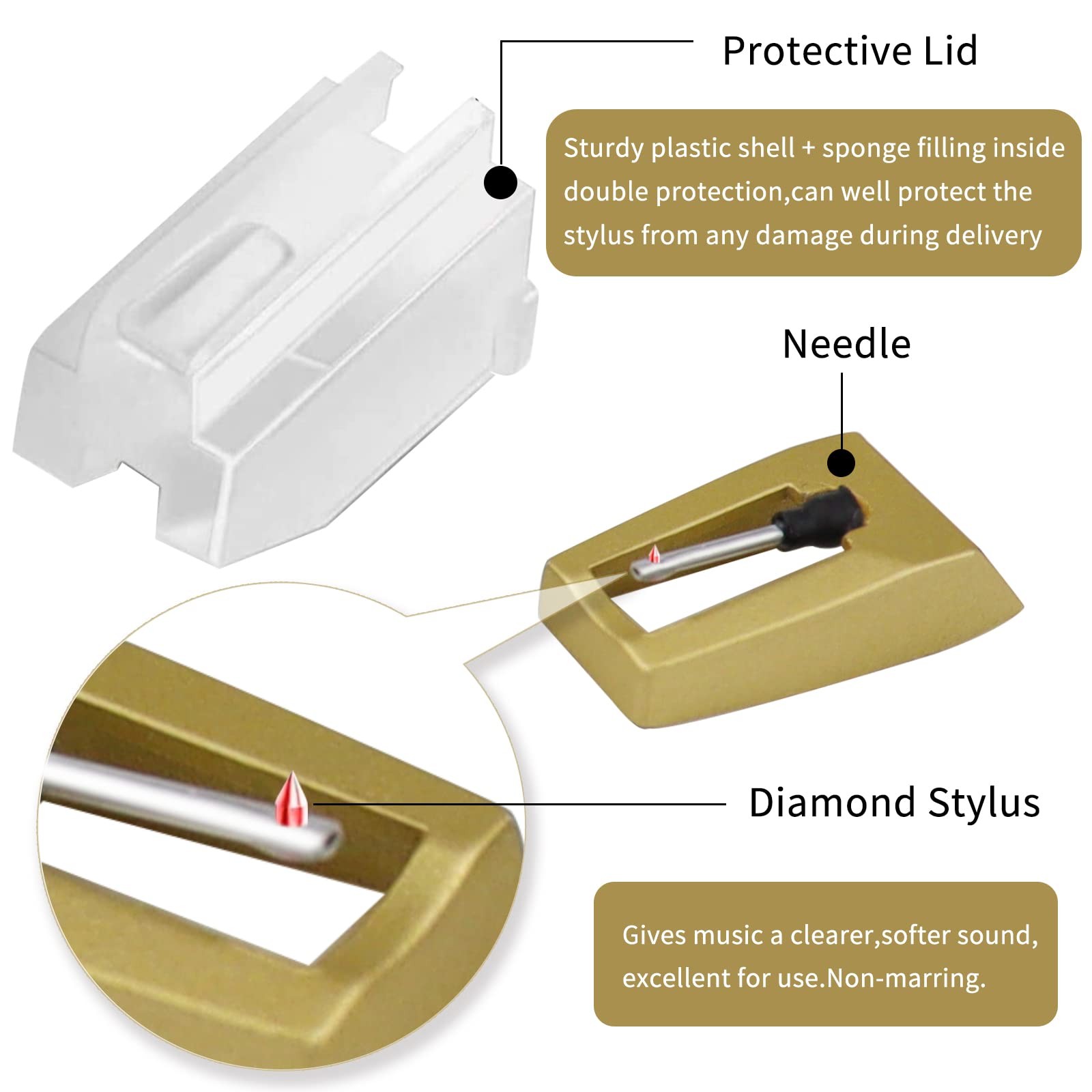 Features: Compatible with Most Record Players: Boytone BT-17DJB, BT-17DJM, BT-17DJS, BT-19DJB-C, BT-19DJM-C, BT-19DJS-C, BT-16DJB-C, BT-17TB, BT-17TBC, BT-21DJM-CDSP, BT-14TBB-SP, BT-15TBSM; Capehart CRN1, CH196B, CH196R, CH196PK, CH196OR, CH196B, CH196GY, CH196DB, CH196BL Crosley NP1, NP6, CR248, CR27, CR43, CR44, CR46C, CR48C, CR49B, CR49TA, CR49TW, CR50TW, CR53, CR67, CR69, CR70, CR73, CR77, CR78, CR79, CR704, CR711, CR712CD, CR87CD, CR6019A, CR8005A, CR7008A, CR6019A, CR8005A, G6082; CROWN CD2000, MZ1100, MZ2150 EANOS 300, 501, 502, 700 Fisher ST141, ST05D, ST707J GPO Jam, Empire, Stylo, Attache GRACE DIGITAL AUDIO GDI-NDL2 HYPE HY-2004-BCT ION iCT05RS, iCT09RS, Quick Play LP, Power Play LP, Quick Play Flash, Contour LP, Vertical Vinyl, iLP, Archive LP, Forever LP, Live LP, Pure LP, iLP, Max LP Innovative-Technology ITRR 501, ITRRS300, ITVS-750 Jensen JTA 222, JTA 230, JTA 300, JTA 380, JTA 410, JTA 420, JTA-450, JTA 460, JTA 475, JTA222NDL Leetac 402-M208-165, TAP512 MAGNAVOX AS305M 3702, AS9406 3701 Pfanstiehl 793D7,793S3 Soundesign 5868, 5869, 5871, 6821, 6822, 6833, 6842, 6846, 6848, 6854 Sanyo ST05D, ST707J THOMAS PACCONI TCP-MSE825 TechPlay ODC5, 15, 16, 17, 18, 26, 27, 28, 35, 38,110 Teac DC2800, GF30, GF180, GF300, GF600, STL103 York Yorx M2408, M2409, M2676, M2202, M2203, M2408, M2409, Q802A Specification: Turntable Needle Stylus Force: 4-6 grams Output: (at 1K Hz=3.54cm/sec) 200-300MV Channel Distortion:≤ 3 dB Seperation: ≥ 15 dB Frequency Response: 80-10000 Hz (7dB) Package included: 1 x Cartridge Replacement 4 x Record Player Needles 【Super Quality Replacement Needles 】Our turntable cartridge and stylus needles have high output and excellent durability.Diamond stylus with 4-6 grams needle forces which give a clearer, smoother stereo sound to the music and will not harm your cherished albums. 【Wide Compatibility 】Compatible with most record player in the markets now. Compatible with E.g. Crosley, ION(NOT all models fit for) , Pyle, Jensen, Victola, 1byone , Teac and more.( Please read the product details of the applicable model, if you are not sure, please consult us first.) 【Easy Installation 】 No need tools, you can install and replace the record needle easily by yourself without a booster. 【Replacement Time 】100% brand new recording needle, according to recording and frequency of use, it can usually be used for about 200-300 hours to replace the record player. 【Package Included】 1 x turntable cartridge, 3 x premium record player needles replacement.Each record player needle comes with a white plastic box to avoid damaging the needle. At the time of purchase, compare your current needle with the image and measure it to ensure that it is suitable for your pen.