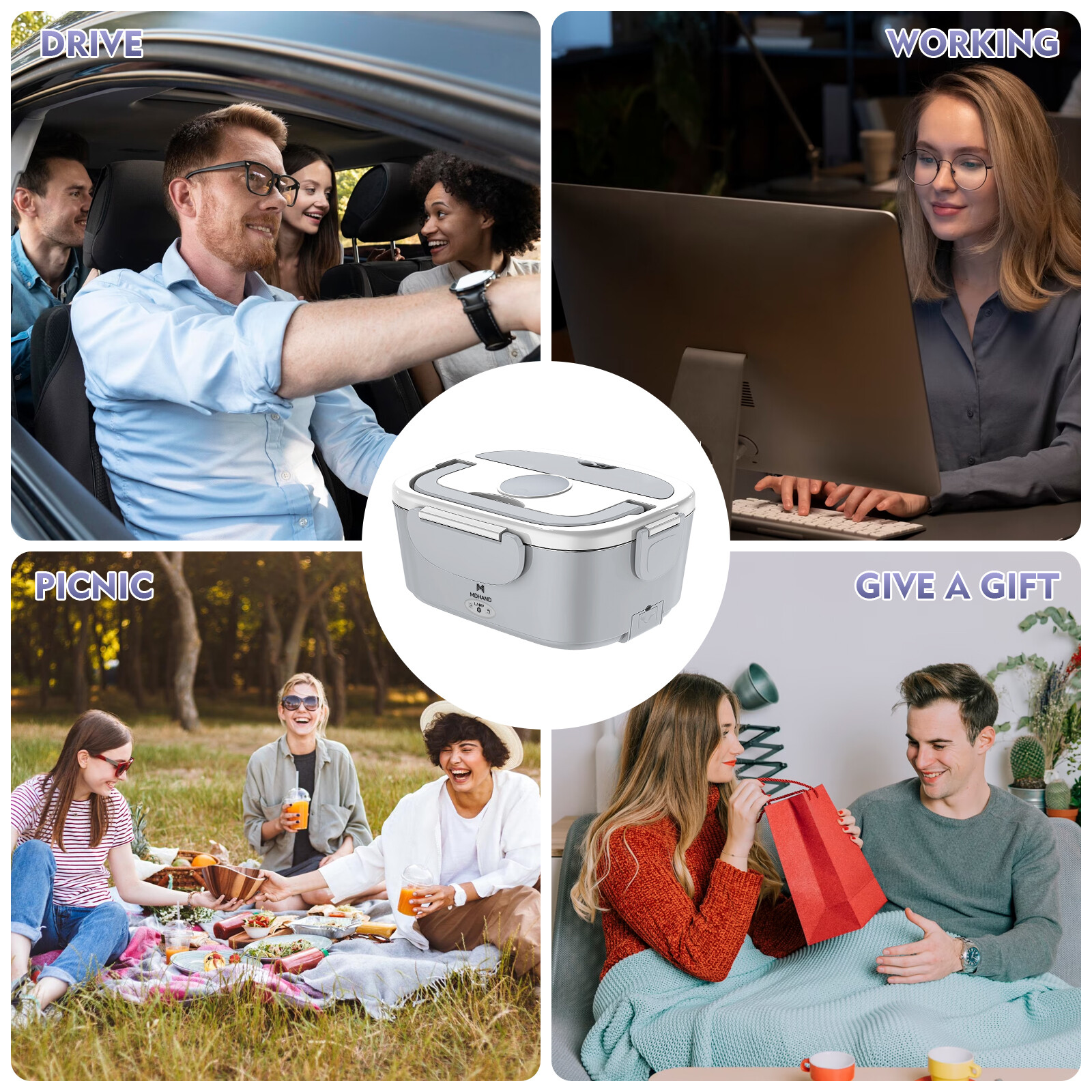 Feature: 【3-in-1 Electric lunch box】From now on, with our electric lunch box, you can enjoy hot meals anytime, anywhere! This electric heated lunch box supports home/office +12V car and 24V truck use. You will love this heated lunch box. 【65W Fast heating】Our electric heating lunch box uses an upgraded 60W power supply for heating, once plugged in, the heating lunch box will heat up in 25-35 min. This food heating lunch box is designed with circulating heat to keep your food nutritious and fresh. It not only heats your meals quickly, but is also easy to clean and dishwasher safe. 【Leak proof design for you】In order to make the food warmer lunch box better sealed, we designed four sides snaps, plus the built-in rubber seal, you no longer have to worry about leakage of soup. Perfect for students, company office employees, construction workers, trucks and others who want to carry lunch by themselves. 【1.5L Super large capacity】1.8L large capacity stainless steel container, you do not need to be hungry. Our food heater lunch box are perfect suited for you! What's more, we provide a 0.45L plastic compartment so you can place different kinds of food separately. There is a knife and fork on the lid, you can also use it as a cell phone stand to watch movies while eating. 【Warm & Healthy meals】Pls do not wash the electric lunch box as a whole into the water. The portable heated lunch box comes with a insulation bag, don't have to worry about heavy rain and dust, you can carry the lunchbox easily. If the food was taken out of the fridge, the heating time should be extended appropriately. If you have any questions about our electric lunch box, please contact us as soon as possible!