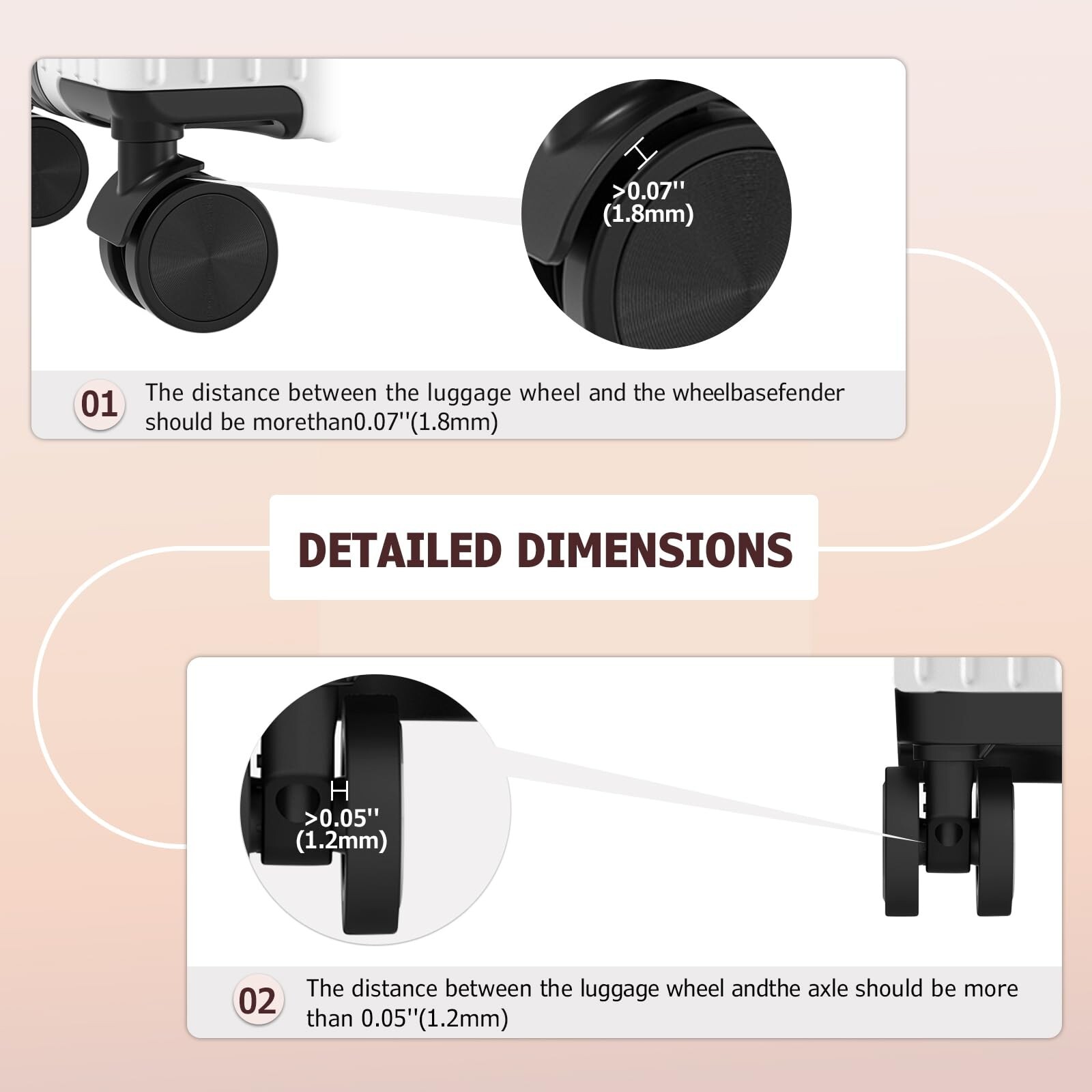 Luggage Compartment Wheel Protection Cover,Latest Upgrade Carry On Luggage Wheel Covers,Level 8 Travel Suitcase Wheel Cover,Anti Dust & Scratch Noise Reduction Wheels Protector(Orange,8) Product Details Color: Orange Brand: XYOFUN MPN: YF021 UPC: Does not apply EAN: Does not apply Product Dimensions: 2.16 x 2.16 x 0.59 inches Item Weight: 2.4 ounces Manufacturer: XYOFUN Country of Origin: China Item model number: YF021 Item Weight: 0.15 Pounds New Upgraded Suitcase Wheel Protectors: This Luggage Wheel Protector Cover Sidewall width upgraded to 0.39 inch (1.0 cm),widen wrapping areaof the edge,firmly wrapped will not fall off For 2-2.4in 8 Wheels Suitcase: This Level 8 Luggage Wheel Protector is suitable for suitcases with wheel size between 2.0-2.4",the distance between the luggage wheel and wheel base fender should be more than 0.07"(1.8mm),and the distance between the luggage wheel and axle should be more than 0.05"(1.2mm) High Quality Wheel Covers: This Baggage Caster Wheel Covers is made of high quality silicone material,very soft & stretchable,with unique wheel design,it can effectively reduce the noise generated when dragging the suitcase,and shock-absorbing & anti-scratch,can effectively protect your luggage wheels Multiple Colors Available: Our Suitcase Wheel Covers are colorful and highly recognizable,you can choice it freely according to your preferences,after use,there is no need to worry about picking up the wrong luggage at the airport, making your journey more comfortable and enjoyable After Sales Service: Our Silicone Luggage Wheel Covers come in a pack of 8 and are suitable for use with 8 wheeled luggage.Please read the content of the main picture carefully to confirm your luggage wheel size and clearance before purchase,if you encounter any problems,please contact us