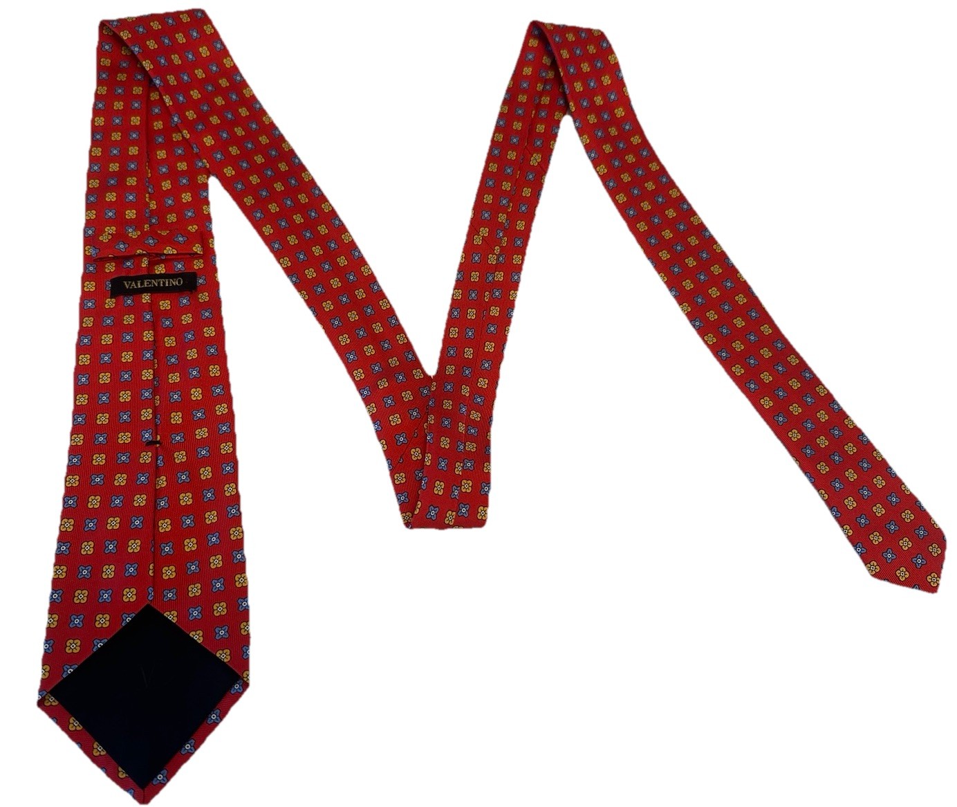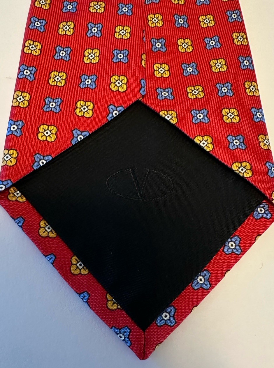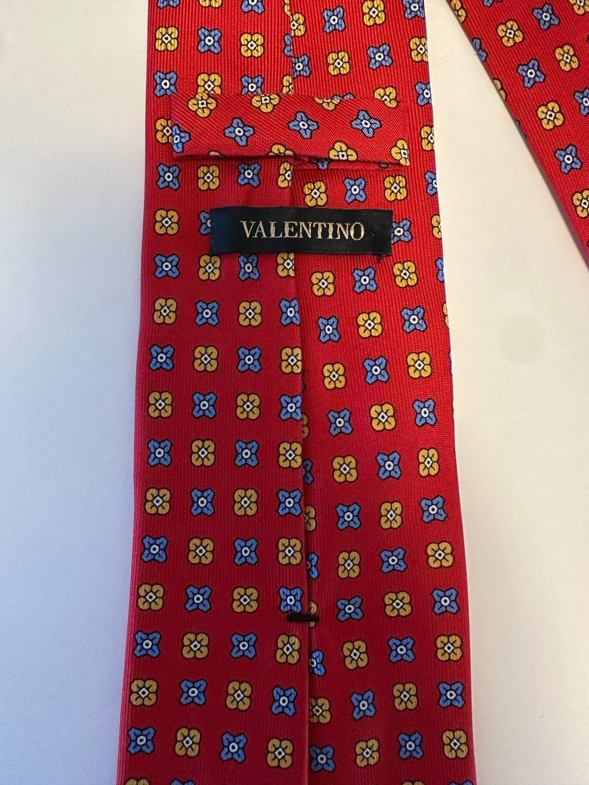 Key Features • Brand: VALENTINO (often associated with Valentino Garavani, the founder of the design house). • Material: 100% Silk (as indicated by the tag: 100% SETA - SOIE - SILK - SEIDE - SEDA). • Origin: Made in Italy, ensuring high-quality craftsmanship. • Color/Pattern: The tie features a rich red background. The pattern is a densely woven geometric/medallion motif, with small, four-lobed floral/clover-like shapes alternating between yellow/gold and royal blue with black accents. This type of repeating geometric pattern is often referred to as a foulard or medallion pattern. • Condition: Excellent pre-owned condition, no visible stains, pulls, or tears. Silk is crisp and vibrant. Measurements: 3.5x59” Design Details • Construction: High-quality silk with a visible weave texture, suggesting a luxurious handfeel. • Reverse: Features the "VALENTINO" tag loop and a black silk tipping on the broad end, which includes a subtle embossed or stitched V logo (as seen in the closeup image). Styling Suggestion This classic, yet vibrant, Italian silk tie is perfect for a business professional, a wedding, or a sophisticated evening event. The deep red color pairs exceptionally well with charcoal, navy, or light grey suits.