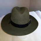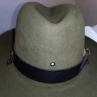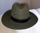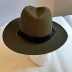This vintage Beaver hat in olive green is in never worn condition. It can use a brushing, but should clean up like new. It has a very unique olive green color. Marked a XXX beaver. The hat features somewhat of a fedora style. The size is 6 5/8 and the material is beaver fur felt, making it a high-quality and durable accessory. The leather band connects to the neck strap and is in new condition. This may be a vintage law enforcement hat...it has a grommet hole in the front center that may be for a police badge or game warden emblem. There are a few marks on the underside of the brim (see photos).