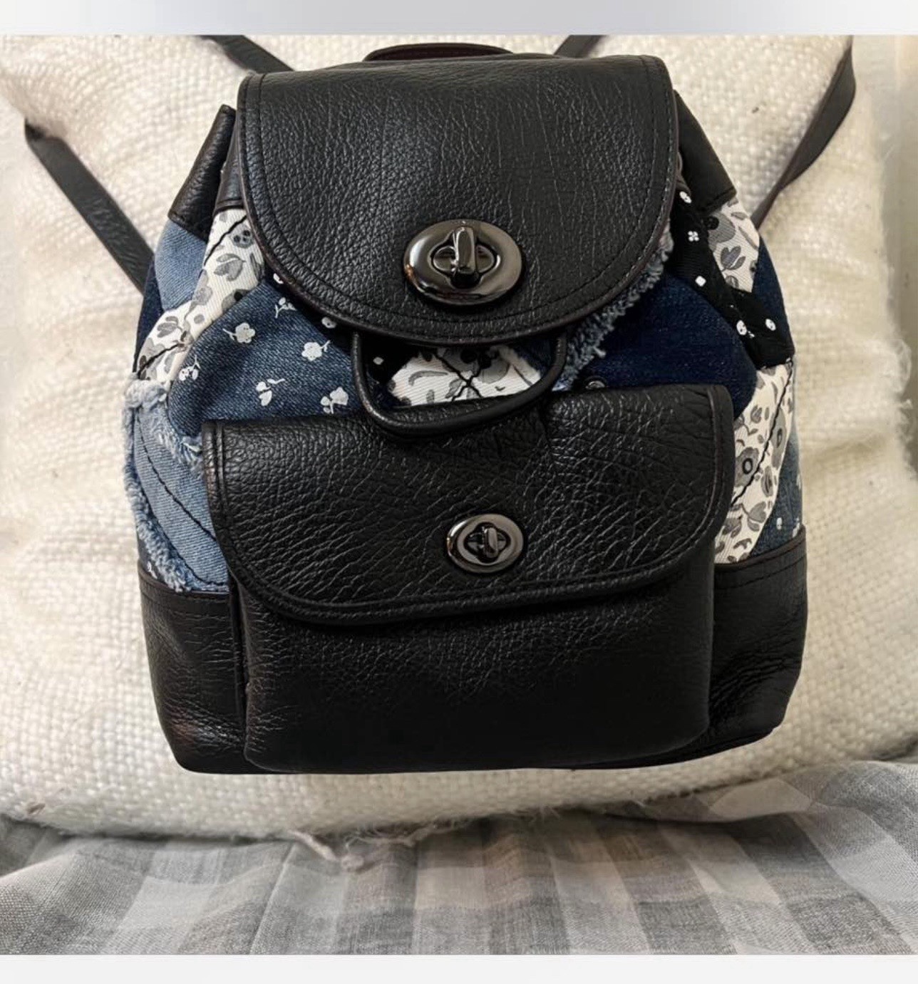RARE VINTAGE Coach Quilted Patchwork Denim Leather Backpack is a stylish and versatile vintage accessory perfect for casual occasions. Made from a combination of leather, denim, and fabric with a textured finish, this small rectangular backpack features a unique patchwork design in various shades of black, blue, and white. Includes black leather double handles and silver hardware with drawstring and turn lock closure. With inner and outer pockets for organization, this vintage designer backpack from Coach is a fashionable choice for any woman looking to elevate her outfit.
