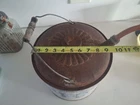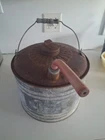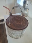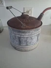The vintage galvanized can with a wooden handle is an old gas and oil can that has been repurposed as a garden watering can. With a capacity of 5 gallons, this collectible piece is a nostalgic reminder of the past when such cans were commonly used in the gas and oil industry. The sturdy construction of the galvanized metal and wooden handle adds to its charm and makes it a unique piece of gas and oil memorabilia for collectors or garden enthusiasts.