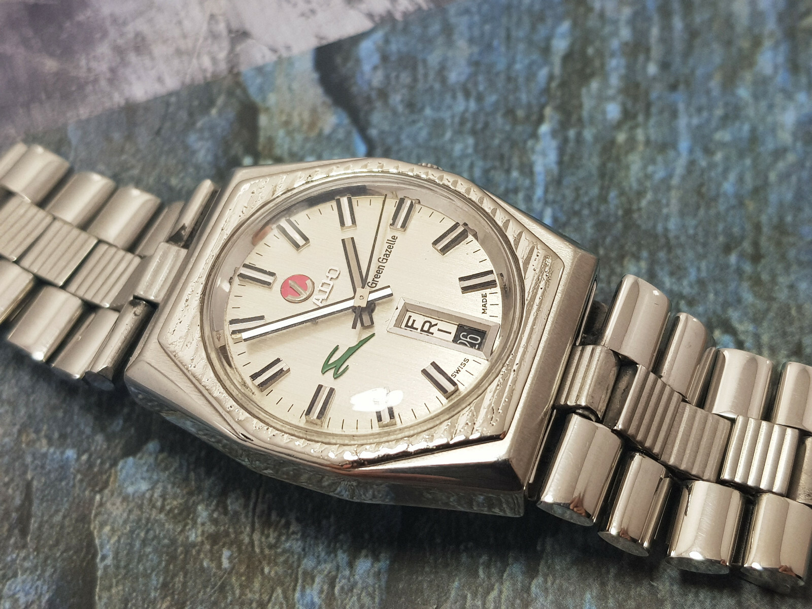 You are bidding on VINTAGE MENS RADO Green Gazelle Automatic Gents Rare. (IT CAN ALSO BE WOUND MANUALLY AS WELL AS BEING AUTOMATIC). DATE is at 3 o’clock Quick SETTING. ORIGINAL DIAL. Acrylic crystal without deep scratch. Dimension: 35.1 mm (include crown). Case: Stainless Steel some scratch. S/S Back Crown original. bracelet original signed. A RARE CATCH & Highly Collectibles. Pictures describe thousand words.. THIS IS A VERY HANDSOME AND A RARE COLLECTABLE THAT IS READY TO WEAR. CHECK OUT MY OTHER AUCTIONS FOR SOME STUNNING WATCHES,PLEASE LET ME KNOW IF U HAVE ANY QUESTIONS,GOOD LUCK. please keep in mind that vintage watches do not always have the timekeeping accuracy of their modern quartz . International Buyers – Please Note: Import duties, taxes, and charges are not included in the item price or shipping cost. These charges are the buyer's responsibility. Please check with your country's customs office to determine what these additional costs will be prior to bidding or buying. As this is a vintage watch, we do not recommend exposure to water or liquids. We are Shipping via ePacket or Registered mail with tracking number. Please note for ePacket or Registered Shipping, order shipped within 2 business days, will take 15-30 business days or 4-8 weeks some country to deliver. Tracking status doesn't update daily, Will update on delivery and again when arrives in your country. We can't control delivery time and Estimated delivery shown on eBay not real delivery time. Sometimes delay. Please check with your country's customs office to determine what these additional costs will be prior to bidding/buying. We cannot be responsible for transit times through customs.