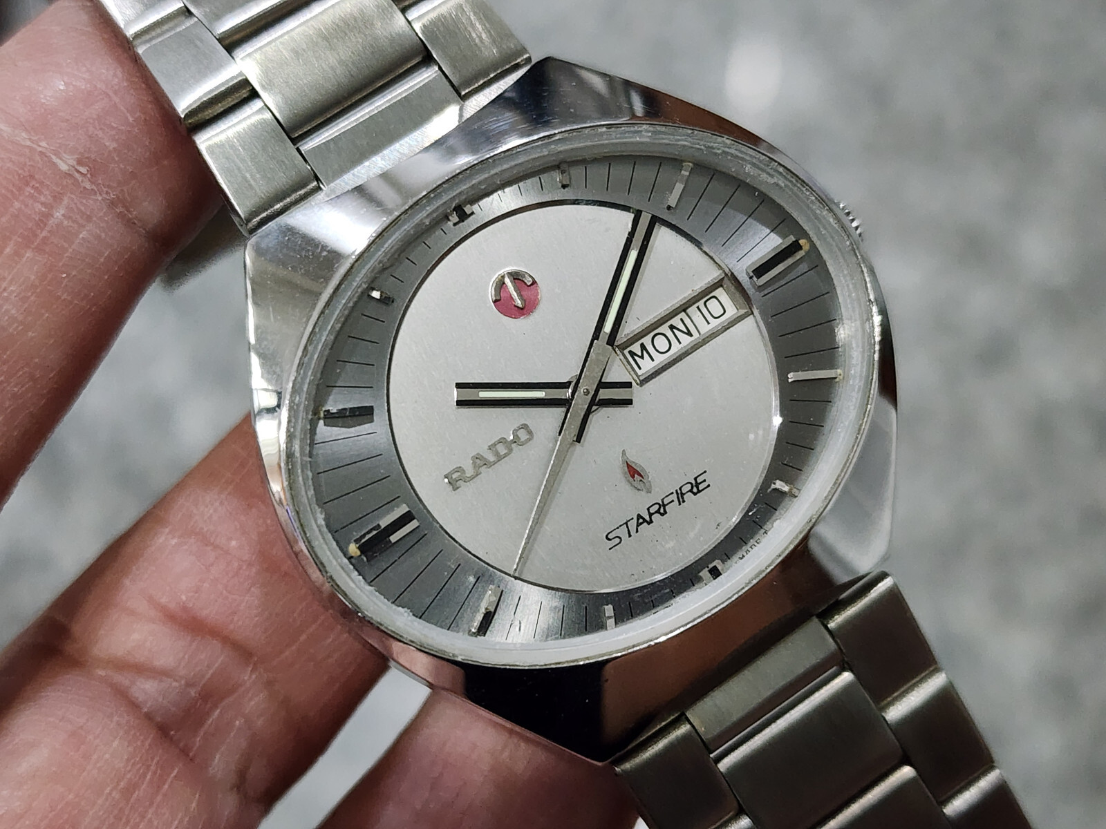ATTENTION AMERICAN CUSTOMERS: Due to uncertainties with regards to the removal of the de minimis exemption on August 29th we will ONLY be sending via DHL Worldwide Express to the United States. Postal service is currently NOT available as many countries have ceased sending to the United States. Please note that new tariffs and duties will be in effect on the arrival of the package and your purchase will require additional payments to USCBP. As there is no stated policy on how these duties will be assigned or collected we strongly encourage America buyers to contact relevant authorities an/or DHL for clarification. We greatly apologize for this and we do hope things will change in the coming weeks. We invite you to message us if you have any questions. You are bidding on RADO STARFIRE AUTOMATIC DATE SWISS MADE STAINLESS STEEL OVAL CASE SILVER DIAL (got some small mark). (IT CAN ALSO BE WOUND MANUALLY AS WELL AS BEING AUTOMATIC). DAY/DATE is at 3 o’clock Quick SETTING. Silver Dial got small mark on it. Mineral glass crystal without deep scratch. Case is stainless steel. Dimension: 42.5 mm * 38.6 mm (include crown and lug to lug). Case: Stainless Steel. S/S Back Crown signed. bracelet signed buckle fit very well. A RARE CATCH & Highly Collectibles. Pictures describe thousand words.. THIS IS A VERY HANDSOME AND A RARE COLLECTABLE THAT IS READY TO WEAR. CHECK OUT MY OTHER AUCTIONS FOR SOME STUNNING WATCHES,PLEASE LET ME KNOW IF U HAVE ANY QUESTIONS,GOOD LUCK. please keep in mind that vintage watches do not always have the timekeeping accuracy of their modern quartz . International Buyers – Please Note: Import duties, taxes, and charges are not included in the item price or shipping cost. These charges are the buyer's responsibility. Please check with your country's customs office to determine what these additional costs will be prior to bidding or buying. As this is a vintage watch, we do not recommend exposure to water or liquids. thank you.
