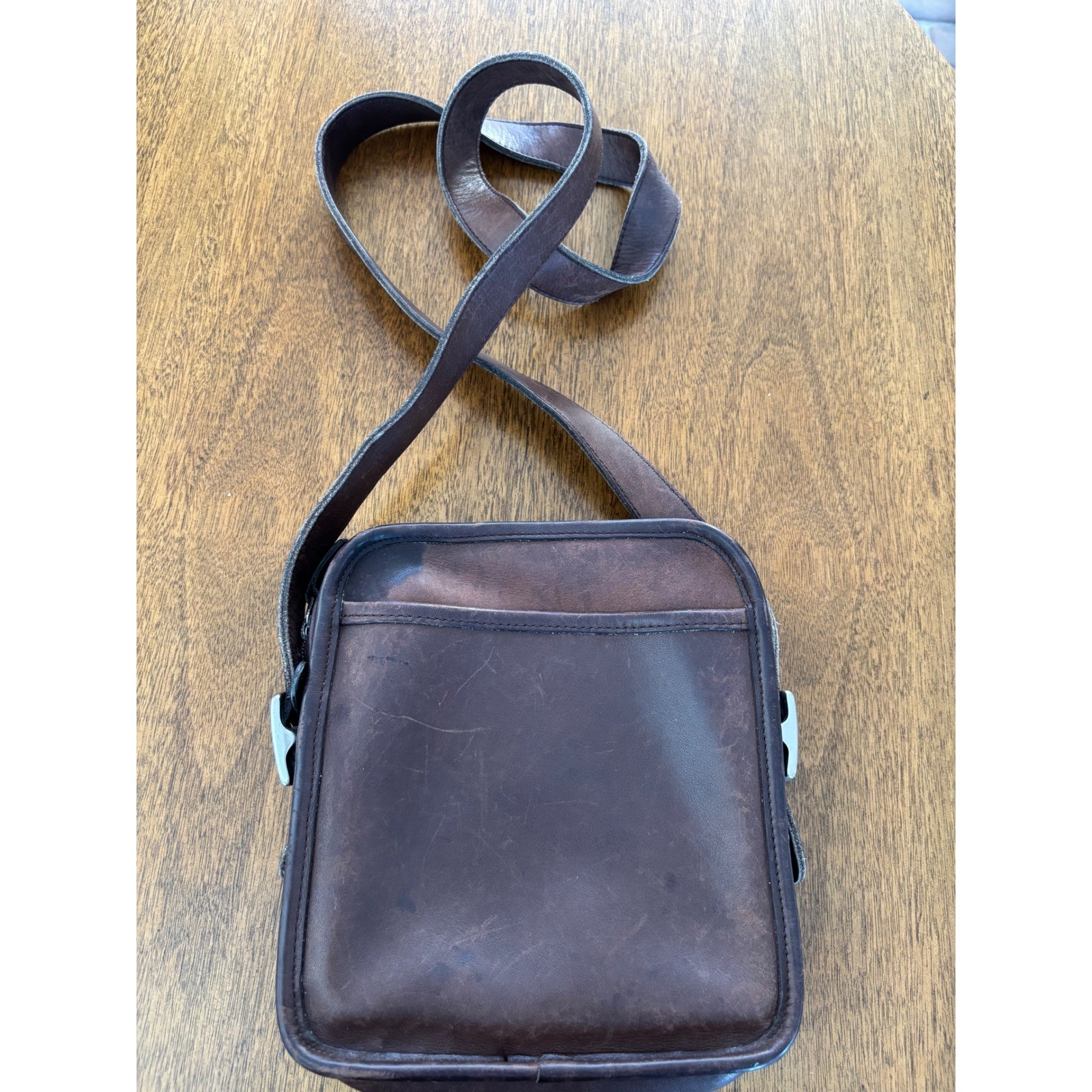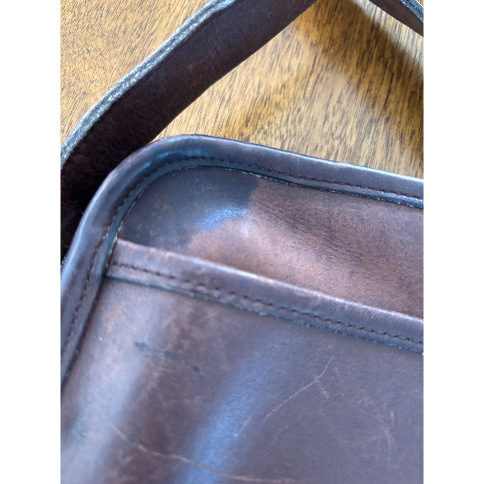 VIntage Coach. Number 300-9817. Has stain on the one side in picture. Discover enduring style with this rich, dark brown leather crossbody bag. Its supple leather exterior develops a beautiful patina over time, adding character and depth to its classic silhouette. The adjustable strap ensures a comfortable fit for everyday we Exterior Material: Leather Style: Crossbody Exterior Color: Brownie Department: Unisex Adults Lining Color: Brown Handle/Strap Material: Leather Handle/Strap Color: Brown Lining Material: Leather Hardware Color: Silver Closure: Zip, Buckle Bag Height: 8 in BAg width: 8 in Accents: Stitching, Buckle Accent, Zipper Keywords: leather bag, crossbody, shoulder bag, dark brown, adjustable strap, everyday bag, classic, vintage inspired, messenger bag, travel bag, daily carry, handbag, fashion accessory