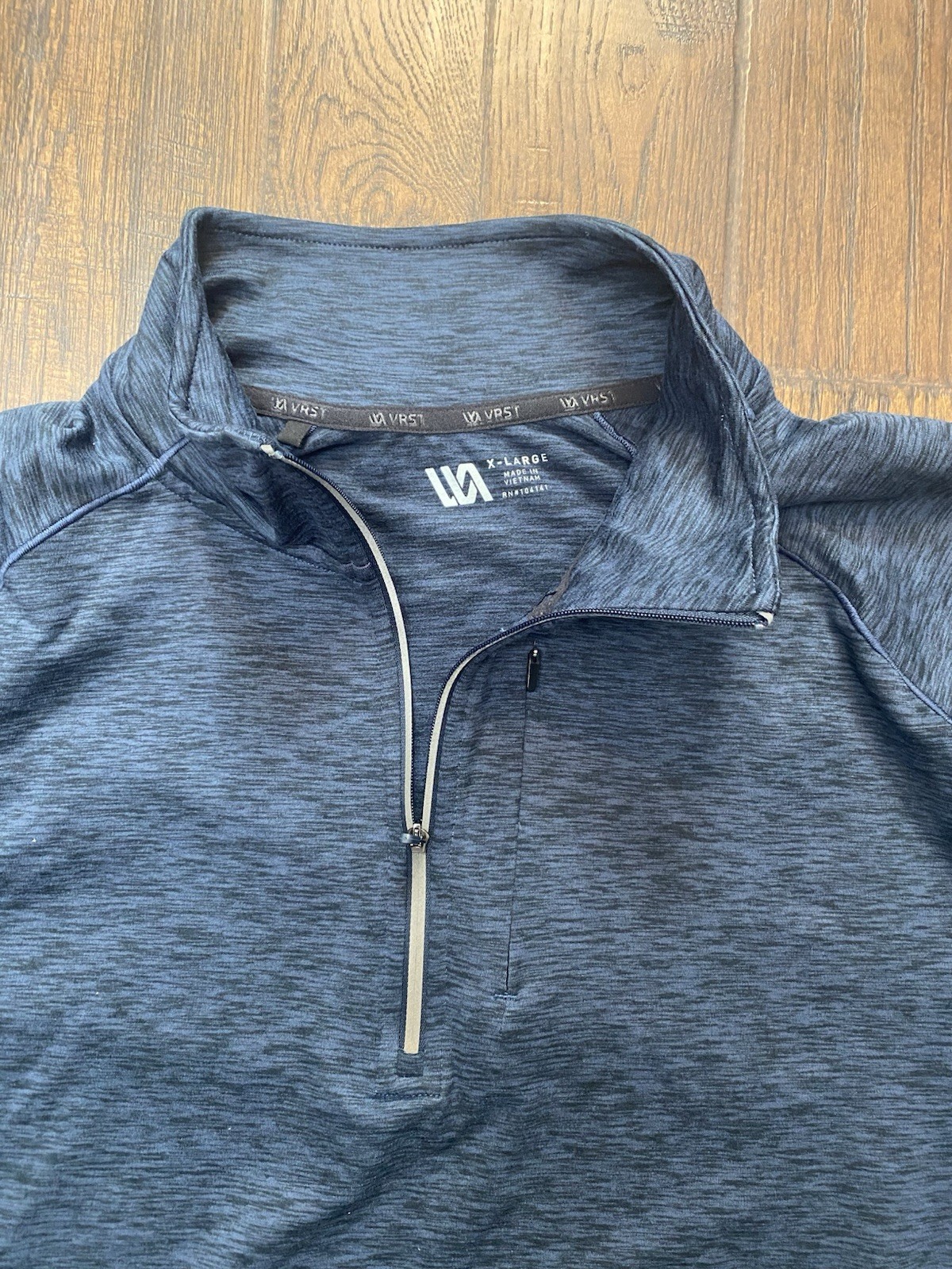 The VRST 1/4 Zip Pullover in size XL is a versatile activewear top suitable for various activities such as golf, cross training, and running. Made with a blended fabric that offers stretch for ease of movement, this pullover in a stylish blue color is perfect for both staying comfortable during workouts and looking sharp while engaging in outdoor activities. With its performance-driven design, this pullover is a great addition to any active man's wardrobe.