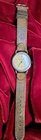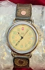 This vintage Swiss Army wristwatch from the 1990s features a silver bezel and case with a beige dial displaying the logo. The watch has a military style with luminous hands and indexes, a date indicator, and is water-resistant up to 330 feet. The Swiss-made watch has a quartz movement and a brow leather two-piece strap, making it suitable for both men and women.Original packaging and papers are not included.