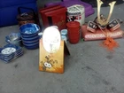 Samurai helmet along with japanese cups, plates and bowls.