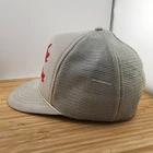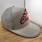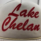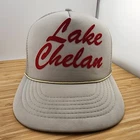 This vintage Lake Chelan foam trucker hat features a solid gray canvas fabric with a coyote logo and red felt text on the front. The hat is designed in a classic trucker style with an adjustable snapback closure, making it suitable for casual occasions. The unisex cap is reminiscent of the popular trucker hats from the past and is perfect for adding a touch of retro flair to any outfit.