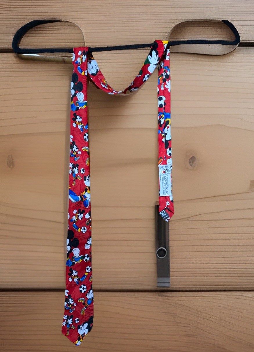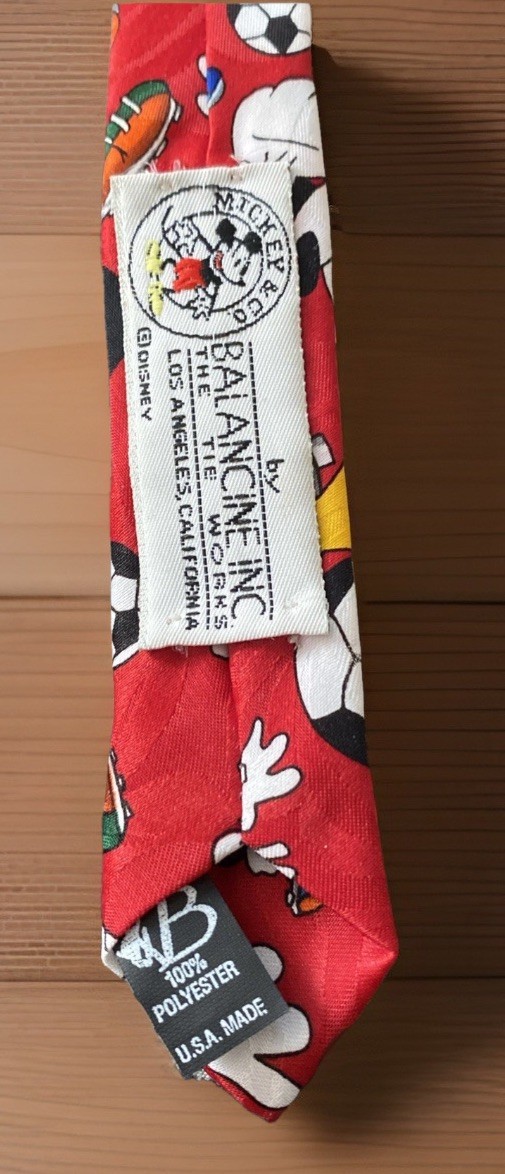 This Vintage Necktie features a Disney Mickey Mouse Soccer Sports Tie made of 100% polyester in red. The tie is woven in the USA and has an embroidered Mickey Mouse logo, making it a vintage piece with a fun and nostalgic theme. It is a one-piece accessory that follows a classic style, suitable for men who appreciate Disney cartoons and characters. The tie is a unique and playful addition to any man's wardrobe, perfect for adding a touch of American sports and comic style to their outfit.