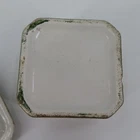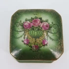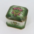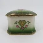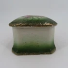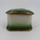 Vintage ceramic trinket/jewelry box Not signed or stamped anywhere Width: 3" Length: 3" Height: 2.2" **measurements are approximate, taken with item laying flat Condition: used, surface wear/tape residue/chips/crazing- see photos, smoke free home Please review all photos closely as these will be the best description of the item. Thank you for shopping!
