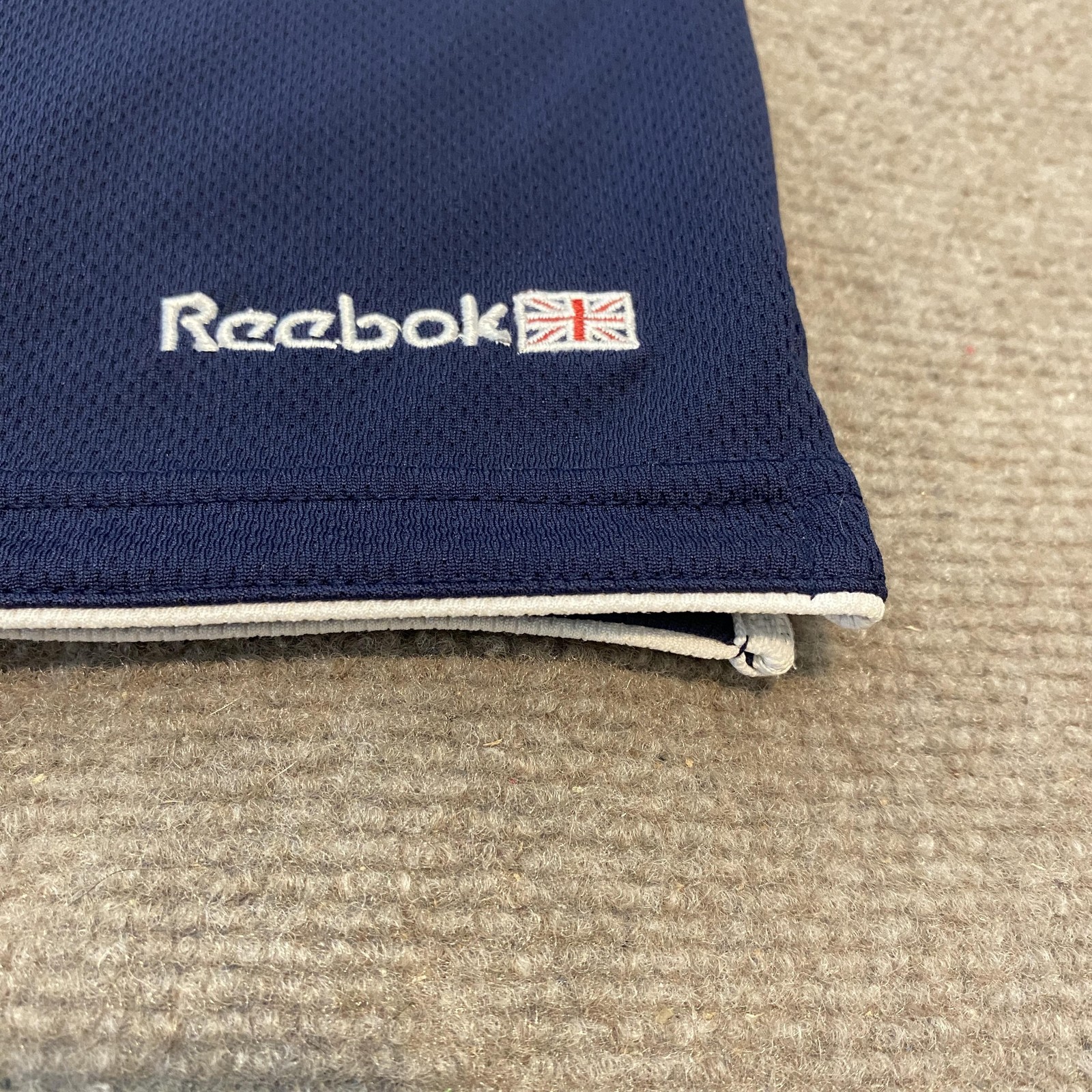 Condition: Good used condition with minor signs of wear; no major flaws observed 100% polyester lightweight athletic fabric Classic navy blue with white trim details at collar and hem Embroidered Reebok logo with Union Jack flag at front hem Tag size: 2XL (Mens) Made in Sri Lanka Raglan short sleeves for enhanced mobility Comfortable fit ideal for sports, workouts, or everyday training See photos for closeups of brand details and garment tag
