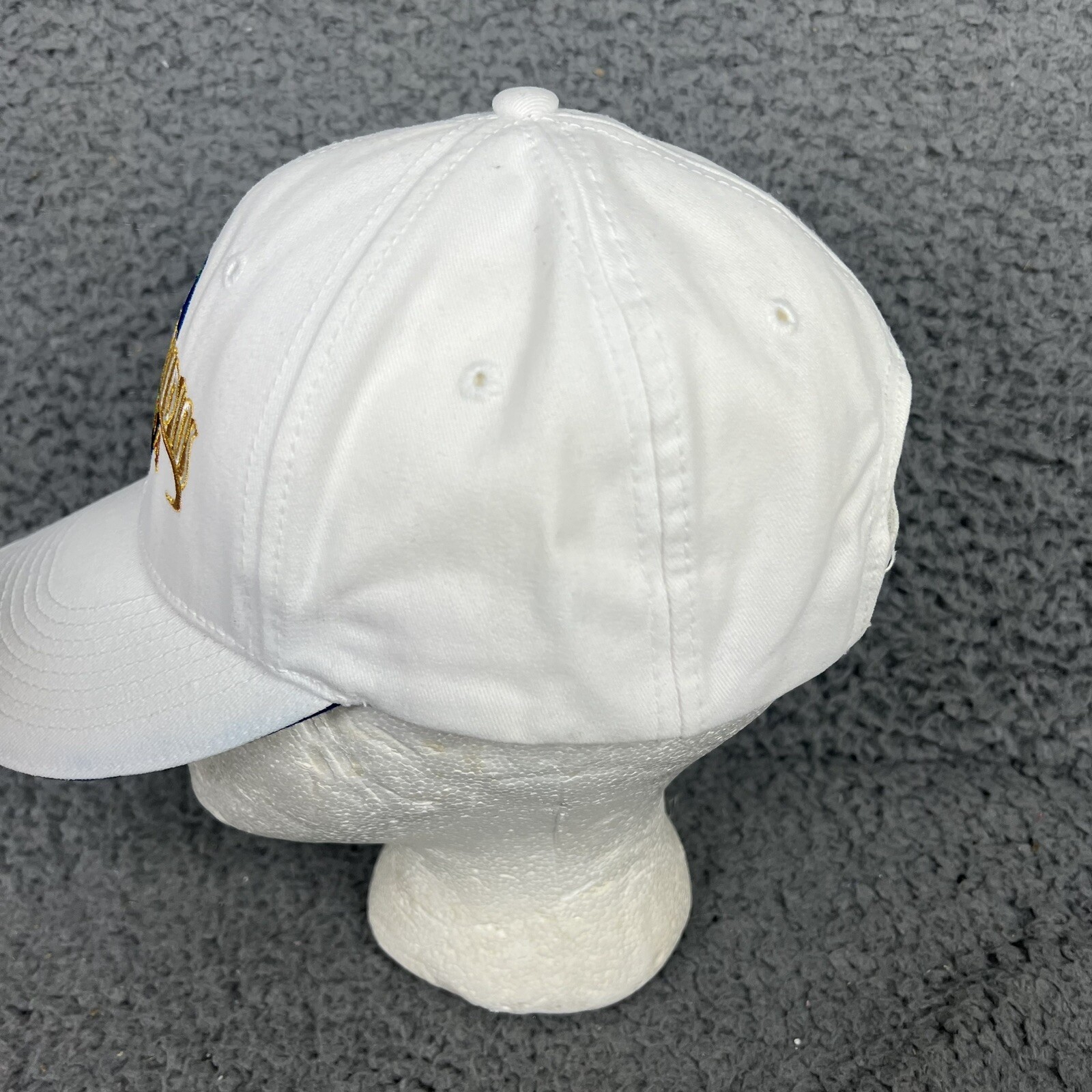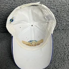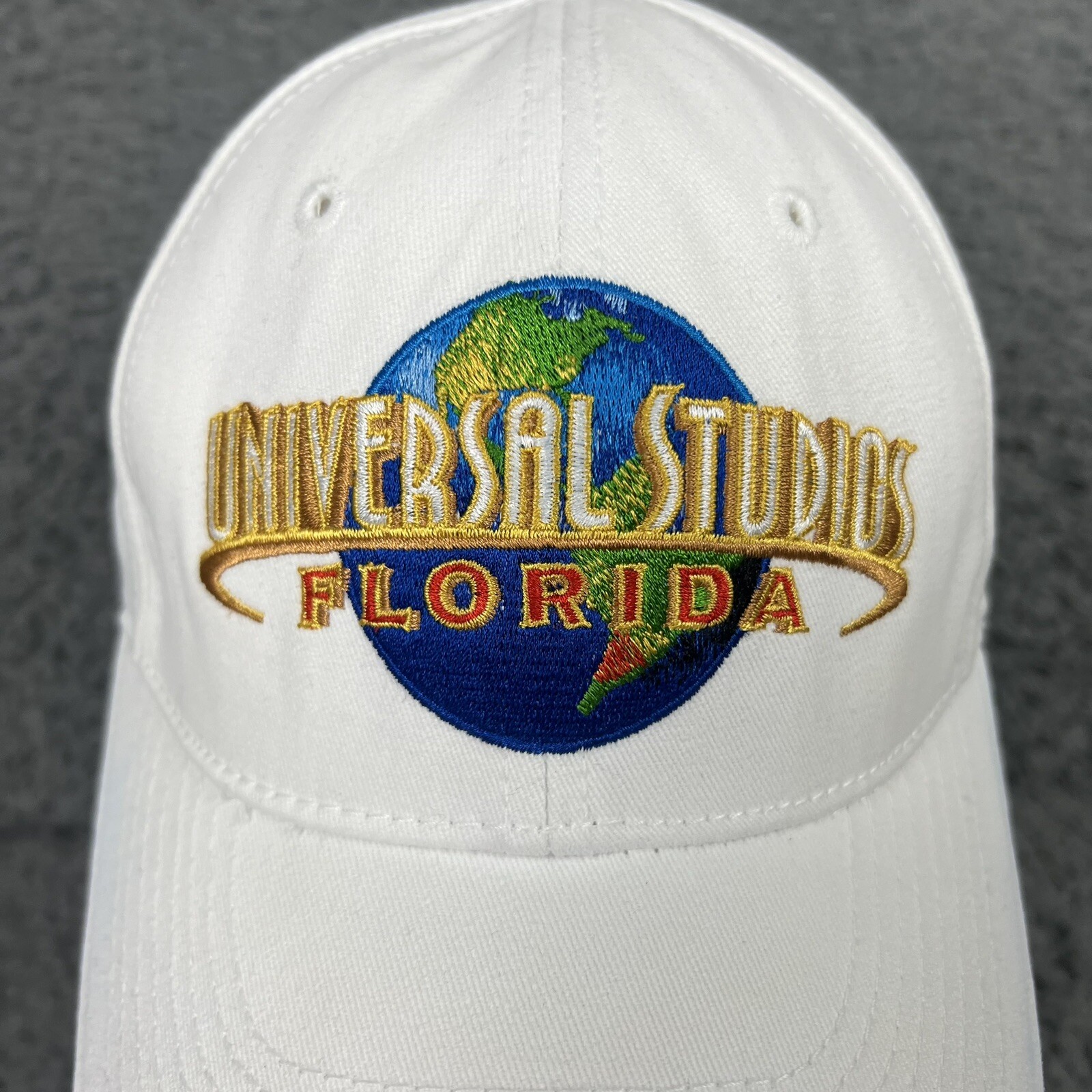 This vintage Universal Studios Florida cap is a must-have for any fan of the amusement park. With its adjustable strapback and unisex design, it's perfect for casual occasions like sportswear or a day at the beach. The cap is made of comfortable cotton material and features the iconic Universal Studios logo on the front. The cap is an original piece from the 1990s and was manufactured in China. Its white color and sporty style make it a great addition to any collection of vintage accessories. Whether you're a dad or just a fan of Universal Studios, this cap is sure to be a conversation starter. NOTE: there is a small blue smudge on the top of the cap.. shown in last pic