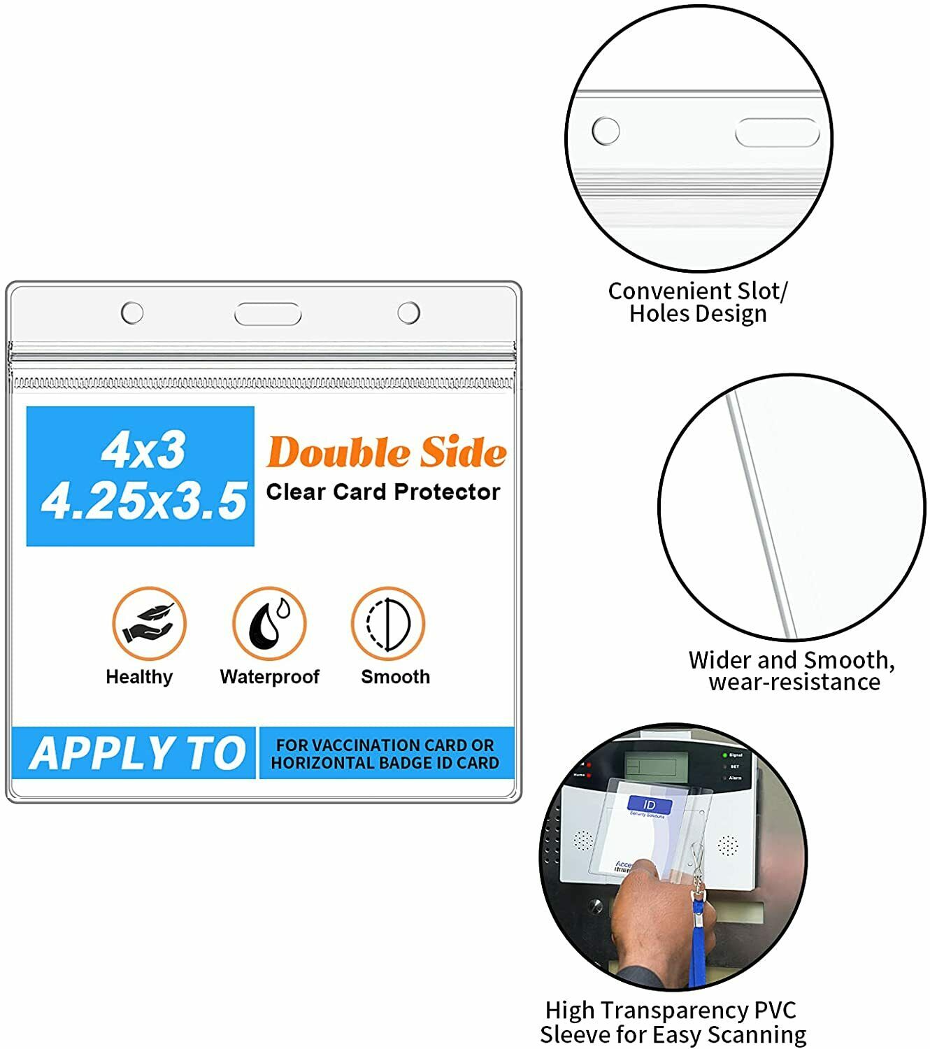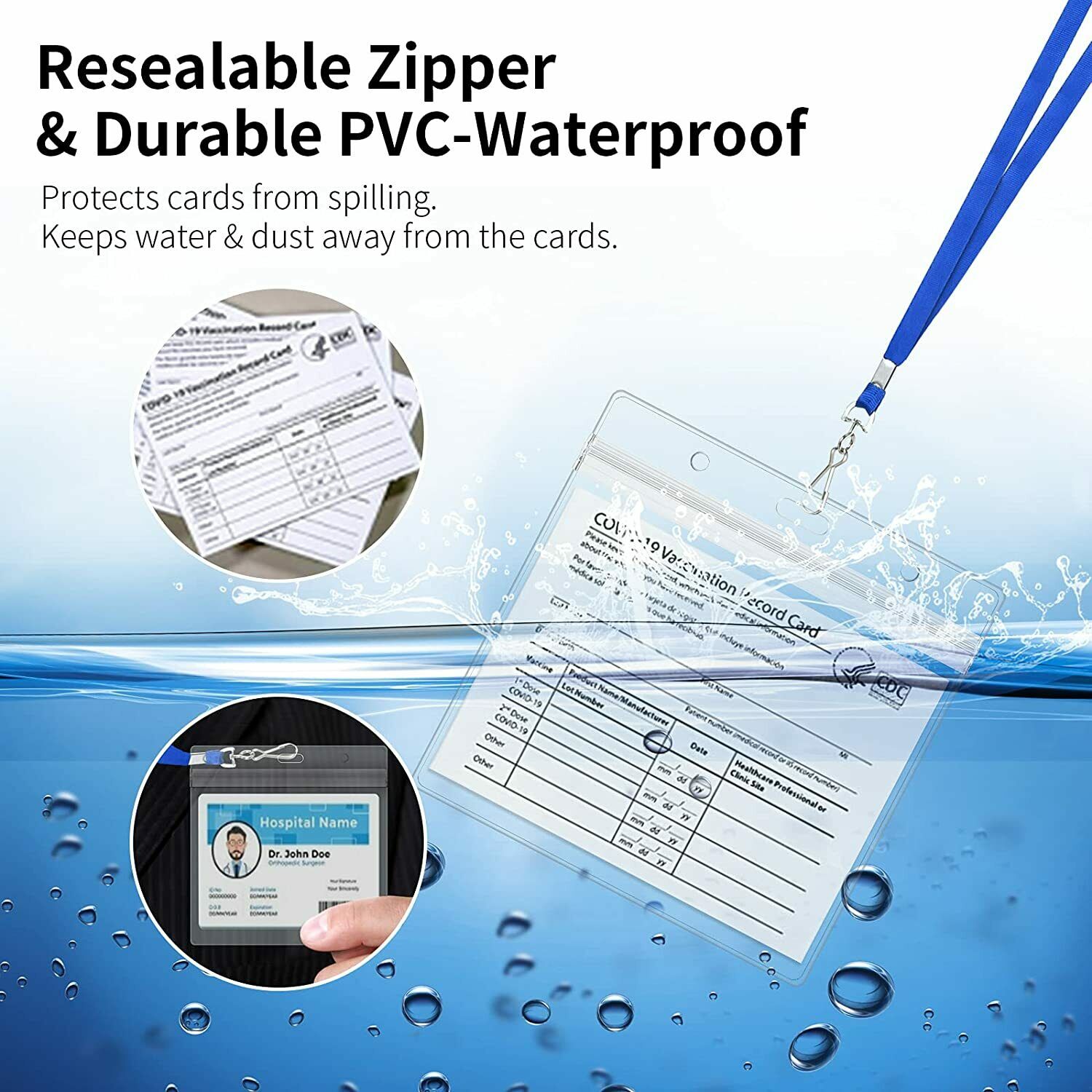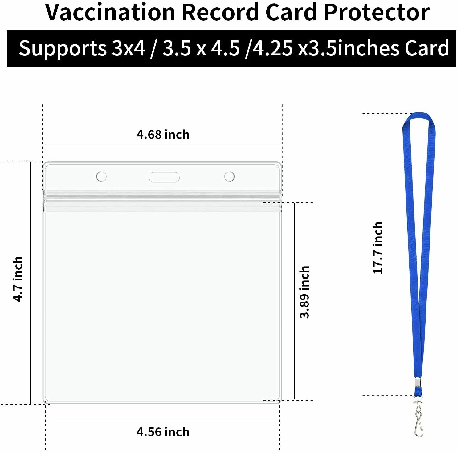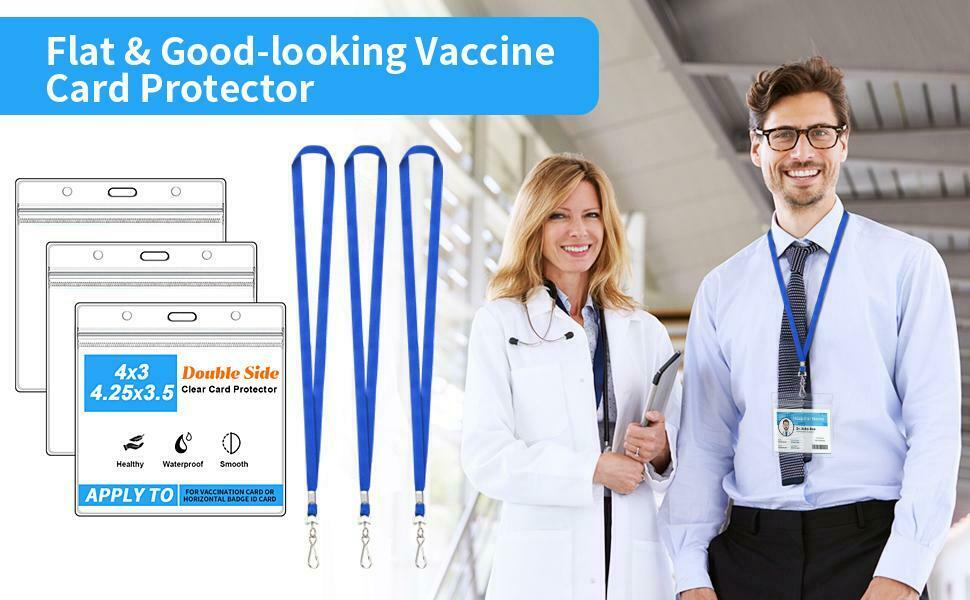 Card Protector 3pcs+3 Clips+3 Lanyards(Packing Listing) Size: 4x3 Card Protector. Outer Dimensions: 3.94" W x 4.53" L, Inner Dimensions: 4L x 3W. Material: PVC material,Waterproof Vaccination Card Holder and Wear-resistant.Resealable zipper keeps contents safe and dry. Occasion: Clear card protector suitable for health record keeper.Multipurpose Great for for doctors, nurses, teachers, students, office employees, government officials, police, volunteers, etc. Design: Dual-use hanging slot/holes design, the middle slot for lanyard, keychain or retractable carabiner reel clip, the both side holes for the cord/strap/string/thread. Strong and Flexible plastic material. The badge holders will not leave trace, folded and refolded many time. The hanging Slot/holes will not break, distorted many time.