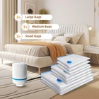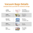 【Reduce Bag's Volume by 80%】Our vacuum storage bags are designed to help neatly organize your closet and clothes, after using it, you can fell that your bedroom or apartment become a clutter-free and bigger zone, and able to pack more luggage into your suitcase when you travel, and use the thick and heavy duty polyester material, which can ensure you to use again and again and the clothes for a long time 【Contain 9 Bags with 3 Sizes】These vacuum bags are available in 3sizes: 3 Large, 3 Medium, 3 Small , which allows you to stuff a large amount of clothes, down jacket, coats, sweatshirts, or puffy comforters, pillows, duvets, multiple sets of sheets, sleeping bags, blankets, towels and so on 【Equipped with Compact Pump】Sucking out the air from the vacuum bag is faster and easier with an pump than a manual pump. Once the bag is packed, all you have to do is wait for the pump to remove all the air from the bag. Then just screw the lid on to seal 【Create Air-tight and Waterproof Seal】Designed with double zip seal and triple seal turbo valve, which can ensure the vacuum Bag 100% airtight after sealed, leading to high levels of protection as well as higher efficiency in storage. Great to protect your valuable belongings from being ruined ! 【Durable & Reusable】These 9-pack vacuum bags are made of high-quality PA and PE blend. It is a soft and healthy material compared to other vacuum seal bags, it can stay sealed for a very very long time and can be used for many packaging purposes for storage, travel or house moving. Moreover, PA&PE materials do not cause any harm to the human body. And these bags are transparent, you can easily see what's inside and find what you need without having to open multiple bags