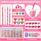 Plentiful Kids Valentines Gift Stationery Set: This 224 PCS Valentines day gifts for kids comes in 28 packs stationery set, 8 PCS per pack. Includes 28 cups with lids, 28 pencils(4 style), 28 greeting cards(4 style), 28 sharpeners(4 color), 28 Erasers(6 style), 28 spinning tops(6 style), 28 3D stickers(7 style) , and 28 stamps(10 style). Our stationery set is the first choice for kids Valentines day gifts which definitely surprise every kid in the classroom Ideal Gift for Various Occasions: With a colorful design and practical functionality, our Valentines day stationery set is very suitable for various scenarios such as study stationery, class rewards, class activities, game prizes, school prizes, goodie bag stuffers, Valentines day gifts exchange, kids party favors, etc. No one can resist such an exquisite stationery set Exquisite Design & Premium Quality: Our practical stationery set is a huge hit with kids because it features many colorful and sweet Valentines day designs including hearts, animals, fruits, etc. It is mainly made of top-quality plastic, paper, and wood that meets the US toy standards. Our stationery set is rather safe and durable for kids school supplies Educational and Unforgettable Time: Using this colorful and practical stationery can not only enhance children's interest in learning but also cultivate their hands-on and social skills. Meanwhile, expressing gratitude and love by writing greeting cards greatly promotes the relationship between parents and children, teachers and students, and classmates. Let's enjoy endless fun and happiness in unforgettable Valentines day activities Easy & Exclusive DIY: No tool, no glue! It's easy to DIY unique Valentines day gifts for everyone. All stationery is colorful and varied. Kids can match different stationery and put them into transparent cups that can be decorated with 3D stickers and greeting cards with heartwarming words. And there is still room in the cup for extra Valentines treats. Personalize your Valentines gifts and let your creativity shine Valentines Day Gifts for Kids Classroom 28 Pack Valentines Day Cards for Kids School Exchange, 224PCS Stationery Set with Cups Party Favors Valentines Day Goodie Bag Stuffers Boys Girls