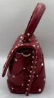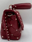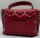 Turn heads with this bold and beautiful Valentino Garavani Candy Stud bag. Crafted in luxurious quilted lambskin leather, this iconic piece features pyramid studs and a structured silhouette that blends edgy glamour with timeless elegance. The detachable strap gives you the freedom to wear it as a crossbody or carry it by the top handle. Details & Features Brand: Valentino Garavani Model: Candy Stud Quilted Shoulder Bag Color: Deep Red Material: Quilted lambskin leather Hardware: Gold-tone rockstud accents Handle/Strap: Top handle and detachable studded shoulder strap Closure Type: Flip-lock closure Interior: Fabric lining with a flat pocket Dimensions: Approx. 9" L x 6" H x 3.5" D Condition: A