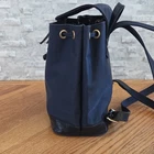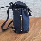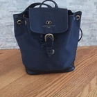 The Valentino Garavani Sport Backpack in navy features gold hardware accents and a stylish buckle accent. This rectangular backpack has a zip closure, drawstring closure, and inner pockets for organization. The top handle and shoulder strap in navy and black are made of nylon and leather, while the interior is lined with black nylon. The designer backpack is part of the Valentino Garavani Sport collection, making it a fashionable and functional accessory for women who appreciate luxury designs.