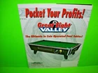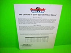test4 Welcome To Chameleon Collectibles Arcade, Jukebox, Pinball Manuals, Pinball Parts, Pinball Flyers, Video Arcade Flyers, Pinball Machine Translites, Rubber Flipper Rings, Coils, Flippers, Promo Plastics, Posters, & more sold here: Chameleon Collectibles Store DESCRIPTION Original promotional sales flyer for the above mentioned coin operated amusement pool table. Flyers are paper advertising literature also called a circular, brochure, or flier. All are single sheets unless noted otherwise. If there is artwork on the back side it will be shown. Size is 8.5" X 11". Opens larger. PAYMENT Paypal accepted. Payment is due within 5 days of auction close. SHIPPING Buyer pays shipping and handling for the first item. Additional items will be free or discounted if combined and paid at once. USA estimated delivery 2-5 business days. International estimated delivery: First Class Mail International = 14-30 business days. Priority Mail International = 10-14 business days. Import duties, taxes, and charges are the buyer's responsibility if a pplicable. Any fees required are not from Chameleon Collectibles they are from your countries customs department. Total value will be shown on customs forms less the postage paid. Items can not be marked as gift on customs forms. COMBINED SHIPPING Important: Please use the eBay cart to bundle and save on your orders. You must add all items to cart and make a single payment to get promo offers and shipping discounts if offered. Best offer sales do not qualify as they are already discounted. ABOUT US Selling on Ebay since 1997. Check our feedback. h Store categories FLIPPER GAMES (By Model Name) (843) 24 (1) AC/DC (5) Addams Family (11) Aerosmith (4) AG Soccer Ball (3) Airborne (4) Attack From Mars (2) Avengers (4) Back To The Future (2) Bad Cats (3) Banzai Run (4) Barb Wire (4) Batman (all versions) (24) Baywatch (3) Big Bang Bar (2) Big Guns (20) Black Hole (3) Big Hurt (4) Black Knight (4) Black Knight 2000 (30) Black Rose (7) Breakshot (3) Cactus Canyon (7) Centaur (2) Champion Pub (5) Checkpoint (3) Cirqus Voltaire (5) Cleopatra (4) Congo (10) Corvette (4) Creature From The Black Lagoon (6) Cyclone (3) Demolition Man (3) Diner (3) Dirty Harry (9) Disco Fever (3) Doctor Who (15) Dracula (Bram Stokers) (2) Earthshaker (5) Eight Ball & Eight Ball Deluxe (8) Elvira & The Party Monsters (4) Evel Knievel (2) F-14 Tomcat (2) Family Guy (4) Fire (3) Firepower & Firepower II (6) Fish Tales (9) Flash (3) Flintstones (3) Flipper Football (5) Frankenstein (2) Freddy A Nightmare On Elm St. (4) Funhouse (5) Game Of Thrones (2) Game Show (3) Getaway High Speed II (5) Ghostbusters (5) Gilligans Island (7) Gladiators (5) Godzilla (2) Guns N Roses (2) Harley Davidson (all models) (13) Haunted House (2) Hurricane (4) Hyperball (5) Indiana Jones (stern & wms) (13) Indianapolis 500 (3) Jackbot (2) Johnny Mnemonic (2) Joker Poker (3) Jokerz (8) Judge Dredd (2) Junkyard (4) Jurassic Park (all versions) (7) Kiss (2) Laser War (11) Lost In Space (3) Lost World (2) Machine Bride Of Pinbot (3) Mario Andretti (4) Maverick (20) Medieval Madness (3) Metallica (3) Monster Bash (3) Mustang (4) Nascar (4) NBA Fastbreak (10) No Fear Dangerous Sports (5) No Good Gofers (13) Operation Thunder (2) Party Zone (5) Phantom Of The Opera (2) Pinball Magic (9) Pinbot (1) Pirates Of The Caribbean (3) Playboy (all versions) (14) Police Force (5) Pool Sharks (6) Popeye (5) Power Play (3) Rescue 911 (5) Revenge From Mars (9) Ripleys Believe It Or Not (5) Road Show (4) Robowar (2) Rocky And Bullwinkle (9) Roller Coaster Tycoon (7) Rollergames (12) Rolling Stones (all models) (4) Scared Stiff (Elvira) (6) Secret Service (2) Shadow (4) Shaq Attaq (3) Simpsons Pinball Party (1) Sinbad (2) Slugfest (4) Sopranos (4) South Park (7) Space Invaders (4) Space Shuttle (2) Space Station (6) Spiderman (6) Star Trek (Stern) (6) Star Trek 25th Anniversary (14) Star Trek The Next Generation (9) Star Wars Episode I (14) Star Wars Trilogy (3) Stargate (1) Starship Troopers (4) Street Fighter II Champion Ed. (3) Striker Xtreme (2) Super Mario Bros (all models) (4) Surf N Safari (2) Tales From The Crypt (1) Tales Of The Arabian Nights (5) Taxi (3) Teenage Mutant Ninja Turtles (5) Terminator 2 & 3 (3) Theatre Of Magic (8) Tommy (24) Torpedo Alley (4) Transformers (3) Truck Stop (8) Twilight Zone (12) Vector (4) Walking Dead (3) Waterworld (3) Wheel Of Fortune (4) Whitewater (3) Whodunnit? (4) Wipe Out (3) World Challenge Soccer (4) World Cup Soccer (10) World Poker Tour (9) Wrestlemania (4) X-Files (1) X-men (5) ARCADE FLYERS VIDEO GAMES (1737) American Laser (12) Atari (195) Capcom (42) Chicago Coin Video (3) Cinematronics (39) Data East (49) Exidy (28) Fabtek (5) Game Plan (10) Gottlieb Video (11) Gremlin (31) Incredible Technologies (28) Konami (93) Meadows Games (12) Midway (257) Namco (65) Nichibutsu (12) Nintendo (53) Other Video Flyers (318) Romstar (25) Sega (211) SNK (36) Stern (29) Strata (12) Taito (91) Technos (3) U S Billiards (7) Universal (26) Williams (34) JUKEBOX PHONOGRAPH FLYERS (432) NSM (76) Other Jukebox (36) Rock Ola (95) Rowe (132) Seeburg (63) Wurlitzer (30) PINBALL FLYERS BINGOS BASEBALL (1226) Alvin G. Pinball Flyers (11) Atari Pinball Flyers (12) Bally Pinball Flyers (237) Baseball Pitch & Bat Flyers (27) Bingo Pinball Flyers (31) Capcom Pinball Flyers (6) Chicago Coin Pinball Flyers (37) Data East Pinball Flyers (27) Game Plan Pinball Flyers (23) Gottlieb Pinball Flyers (306) Other Pinball Flyers (49) Playmatic Pinball Flyers (10) Sega Pinball Flyers (15) Sonic Pinball Flyers (8) Stern Pinball Flyers (127) Williams Pinball Flyers (290) Zaccaria Pinball Flyers (10) OTHER COIN-OP AMUSEMENT FLYERS (742) Air Hockey Table Flyers (14) Dart Game Sales Flyers (37) Foosball Soccer Table Flyers (21) Kiddie Ride Sales Flyers (18) Pool Table Flyers (47) Redemption Arcade Flyers (177) Rifle Shooting Gallery Flyers (71) Shuffle Alley Bowing Flyers (176) Slot Machine Flyers (94) Vending Machine Sales Flyers (8