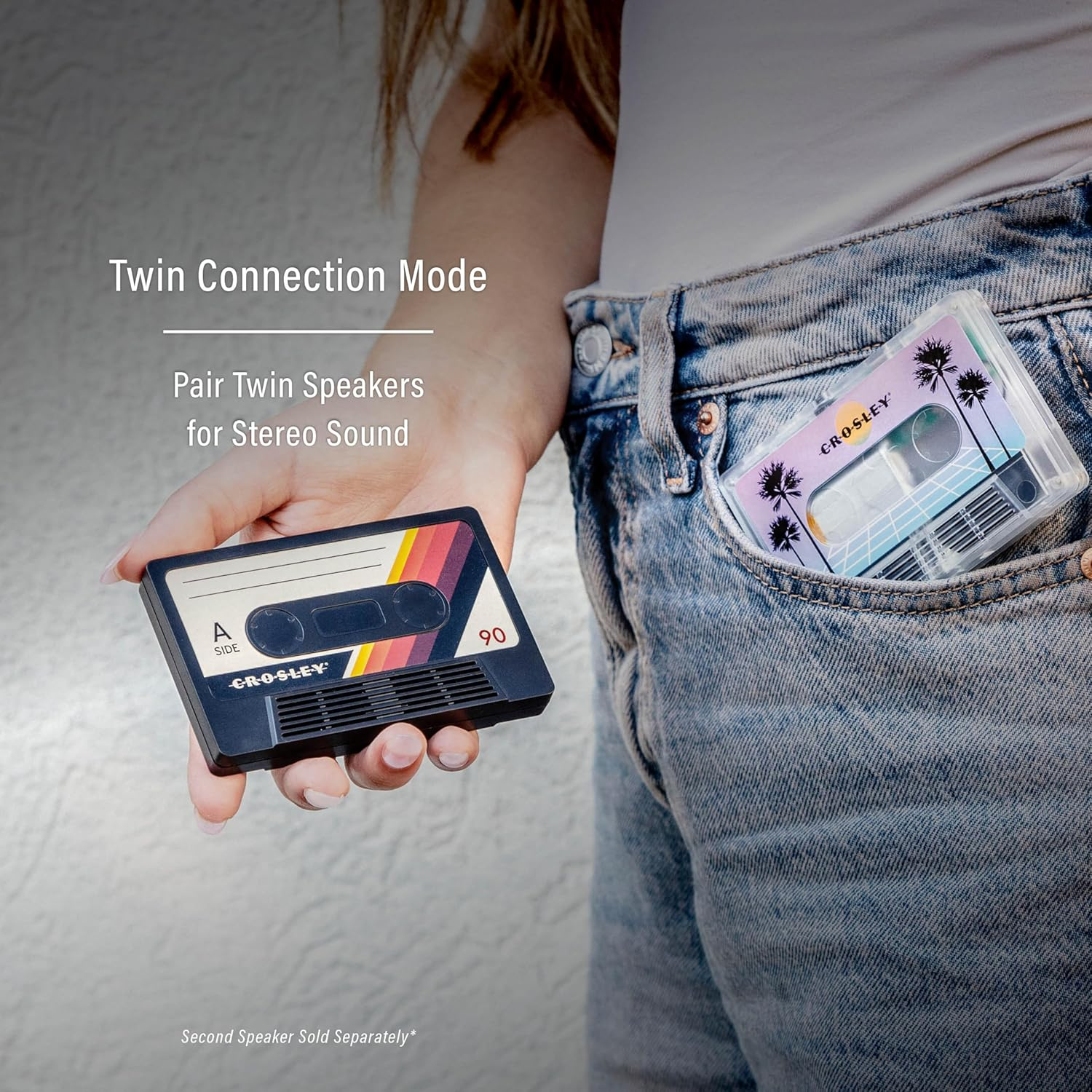 PORTABLE BLUETOOTH SPEAKER: Enjoy music anywhere with this portable wireless speaker. Connect to any Bluetooth-enabled device to stream your favorite playlists or podcasts. SOUND AND STYLE: Designed to look like a real cassette tape, this portable speaker has an aux input for hooking up external audio devices. HOURS OF PLAYTIME: Equipped with a rechargeable lithium-ion battery, this speaker charges via USB-C cable in 2 hours. With a full charge, you get up to 6 hours of music when listening at 50% volume. TWIN CONNECTION MODE: Pair two of these small speakers together to enjoy full stereo sound. (Second speaker sold separately) DESIGN: Inspired by 100 years of Crosley innovations, our products blend vintage looks with modern technology. Crosley Radio products are proudly designed in the USA and come with USA-based customer support. Rewind your style, not your music. The Cassette Tape Bluetooth Speaker gives you that iconic ’80s mixtape aesthetic without the old-school fuss. Stream wirelessly and enjoy a vintage look with modern tech. Compact, portable, and complete with a matching clear case, it’s perfect for showing off your love for all things retro.