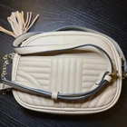 This Vegan Leather Beige Quilted Crossbody Gold Chain Tassel Adjustable Purse is a stylish and versatile accessory for any casual outing. The rectangular shape with a quilted pattern on the exterior gives it a chic and trendy look. The adjustable shoulder strap in beige with gold hardware adds a touch of sophistication. The zip closure and medium size make it perfect for carrying everyday essentials. The black and white fabric lining provides a classic touch to the overall design. The chain and tassel accents add a unique flair to this fashionable shoulder bag.