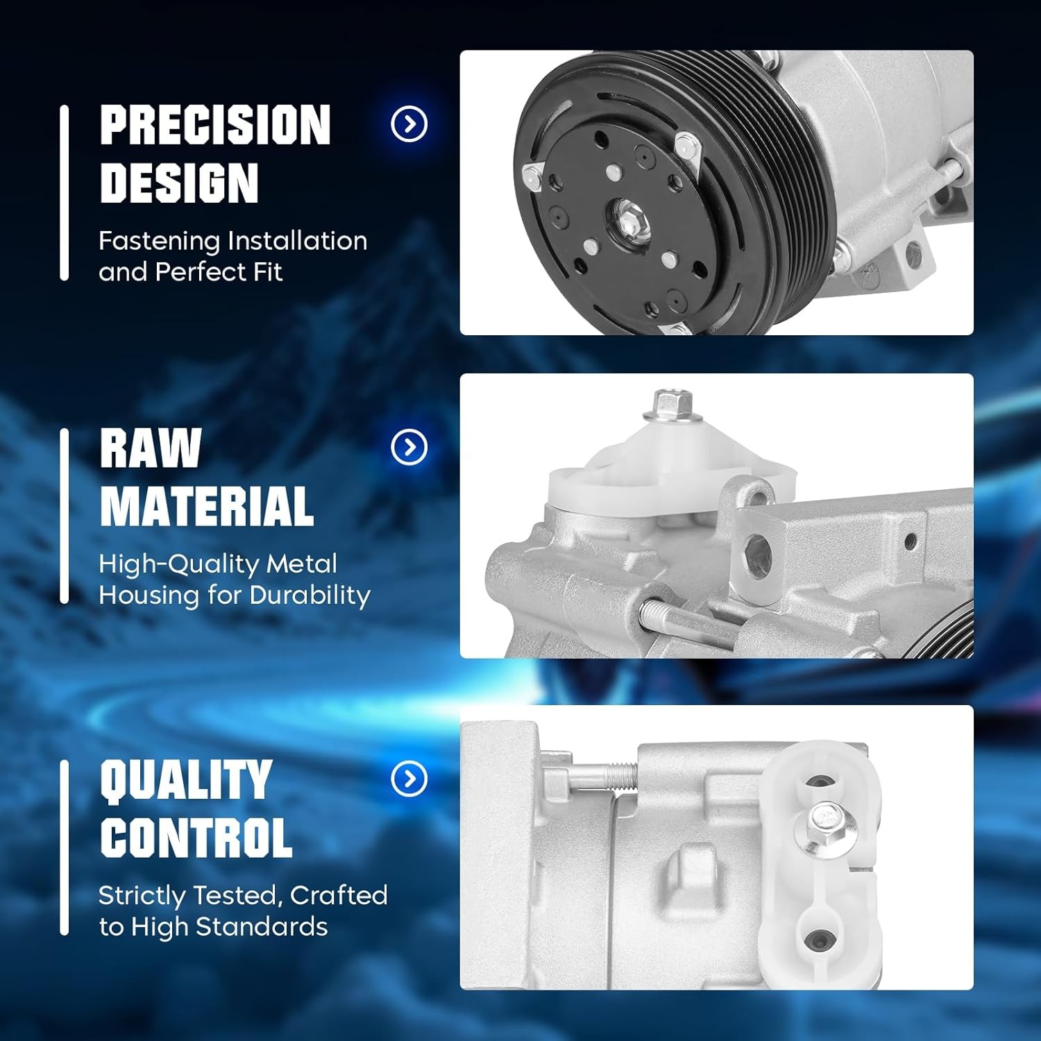 👍 Compatible with: New A/C compressor for Ford: 2003-2005 Excursion 6.0L, for 1997-2001 F-150 4.6L/5.4L, for 1997-2001 F-250 4.6L,for 1997-1999 F-250 5.4L, for 1999-2007 F-250 Super Duty 6.8L, for 1999-2001 F-350 5.4L, for 1999-2007 F-350 Super Duty 6.8L, for Lobo 4.6L 1997-2001, for Lobo 5.4L 1999-2001, for Lincoln Blackwood 5.4L 2002 👍 Replaces for Part Numbers: 1520694, 1035112, 1135112, 1235112, 618152, 4718121, 4718144, 4L3Z19703AB, 4L3Z19703AC, 5C3Z19V703AA, 6L3Z19712BA, F7LZ19V703RA, 57152, 58152, 2041028, 6511461, 7511461, 7512140, YCC163, YCC179, YCC214, 2010918AM, 143028C, 143028NC, 143028NEW, 2604, 2604N, 10000535, 000101, 010022, 010473, 10343121, 2010918, TEM273184, TEM253184, 253184, 273184, 57152 👍 Careful manufacturing: Air conditioning compressor adopts excellent materials and advanced technology, which greatly improves its performance and durability and prolongs its use time. 👍 Cautions: Before installing the air conditioning compressor, clean your car's cooling system pipes and check that the fan and condenser are working properly so as not to affect the use of new parts. 👍Compressor Specifications: Oil Type: PAG 100;Oil Prefilled: 160±10ML; Pulley Grooves 6; Pulley Diameter (mm) 127