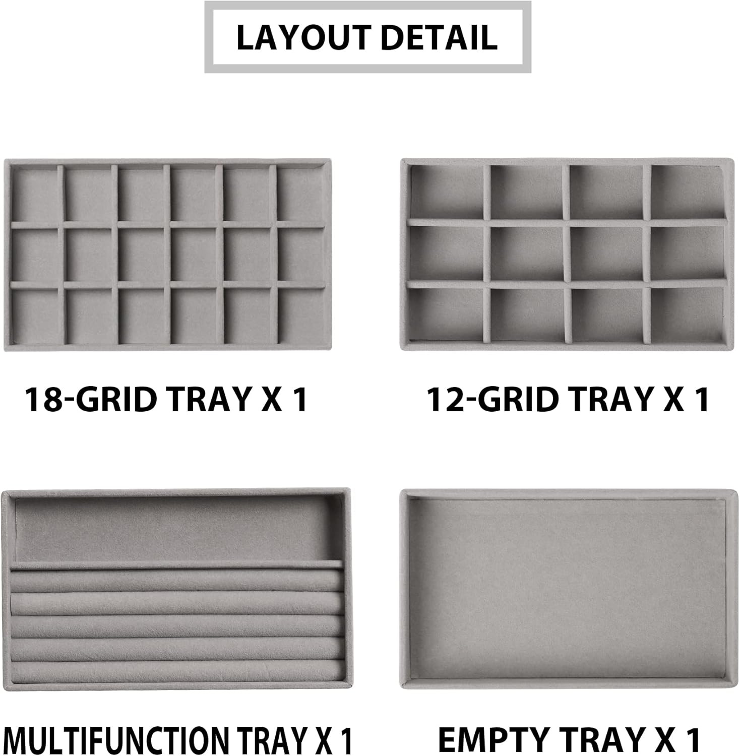 Store New Arrivals Add to Favorite View Feedback Contact Jewelry Organizer Tray,Stackable Velvet Jewelry Trays,Drawer Inserts Earring Organizer for Women Jewelry Storage Display Case for Rings Stud Necklaces,Set of 4(Grey) Description Item model number Small Velvet Tray Set 4 Grey Style Modern Number of Items 4 Jewelry Storage Type Jewelry Tray Number of Compartments 4 Batteries required No Special Feature Adjustable Product Dimensions 4.9"D x 8.3"W x 1"H Material velvet Number of Drawers 4 Finish Type Brushed Closure Type Buckle Item Weight 15.1 ounces Occasion Friendship Day Target Audience Women Mounting Type Table Top Color Grey Inner Material velvet Shape Rectangular Recommended Uses For Product Ring Finish types Brushed Number of pieces 4 Size Set 4 Set of 4 : Include 18 grids tray(1 pc),12 grids tray(1 pc), versatile tray(1 pc) with 4 ring slots and 1 long compartment , empty tray(1 pc) , These trays can perfectly storage your earrings studs necklace and bracelets etc. Premium Material : The tray's frame are made of composite board which is very sturdy and velvet wrapped on the composite board is very soft that can protect your precious jewelries away from scratches and other damages. Stackable and Adjustable : All these trays are easy to stack,take less space while can storage much;Dividers in the grid trays can be removed so that you can adjust the grid to fit your different size jewelry. Versatile Tray : Our jewelry trays are not only suitable for personal use at home but also very suitable for jewelry store or jewelry shows to display all kinds of jewelries;In addition,they can be used as drawer inserts to keep your dresser well organized. Perfect Gift : With exquisite workmanship and hardware,this stylish jewelry organizer box will be an ideal gift for Valentine's Day, Mother's Day, Thanksgiving Day, Christmas, birthday for your mom,girlfriend,colleague or any other important women in your life. Product Description Frebeauty Velvet Tray Set Are you tired of organizing a ton of your jewelry and taking time to find what you need from the mess? Come on with Frebeauty jewelry tray! Key Details 12 Grid Tray 24 Grid Tray Versatile Tray Empty Tray Specification Size:8.3*4.9*1 inches(Per Tray) Product Information Material : velvet Colort:Black/Beige/Grey Organize Purpose:Earrings/Rings/Necklace/Studs/Brooches About Frebeauty When we created Frebeauty, we want our product to spotlight the person behind the fashion. From choosing high quality material carefully to manufacture product with advanced equipment and technique, each detail shows high quality insurance. You will find how excellent it is! Other Features DIY Your Tray Remobable Dividers Stackable Design ABOUT US We offer the best prices around on high quality products. Our E-store includes media such as books, movies, music and games while offering electronics, toys, sporting apparel, clothing, tools, general home, garden items and more. SHIPPING We are always working hard to ensure your package arrives as soon as possible. Please understand that some factors like weather, high postal traffic, and the performance of shipping companies are outside of our control. We offer free shipping to the lower 48 states and ship within 2 business days of payment, usually sooner. We do not accept P.O. Boxes. Please provide a physical address. For shipping outside of the continental USA, we only use eBay's Global Shipping Program.The item is shipped to KY and then sent to the rest of the world. International customers are responsible for all duties and taxes. Continue to check out in order to calculate costs for shipping the item to your country. Messages regarding eBay's Global Shipping Program MUST be directed at eBay EXCLUSIVELY. RETURNS We offer a 30-Day Return Policy on items which you are not completely satisfied with. You have the option for a full-refund or an exchange of the item. No returns are available on items shipped outside of the USA. PAYMENT We accept PayPal. CONTACT US This page content is yet to come Please ad us to your favorite seller and visit again later Thank You CUSTOMER SATISFACTION We try our very best to make sure every customer is completely satisfied. If there's a problem, message us! We're happy to help. WE ACCEPT Copyright © 2021 AutoDS. | All Rights Reserved