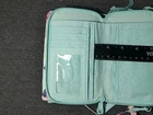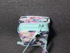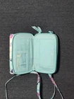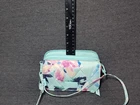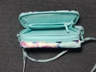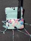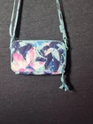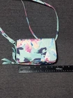 Vera Bradley CrossBody Purse, Aqua Blue with Pink and Navy Blue Floral Print. External- quilted fabric style, internal: aqua blue; solid color. 4.5" tall, 6.5" wide, features 2 zipper compartments, (1) of the zipper compartments has multiple slip pockets and card slots, the 2nd zipper compartment has a divider containing the zipper coin pouch, 1 external slip pocket with flap snap metal button closure. Pre-owned, good condition. Item#000119