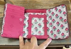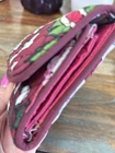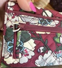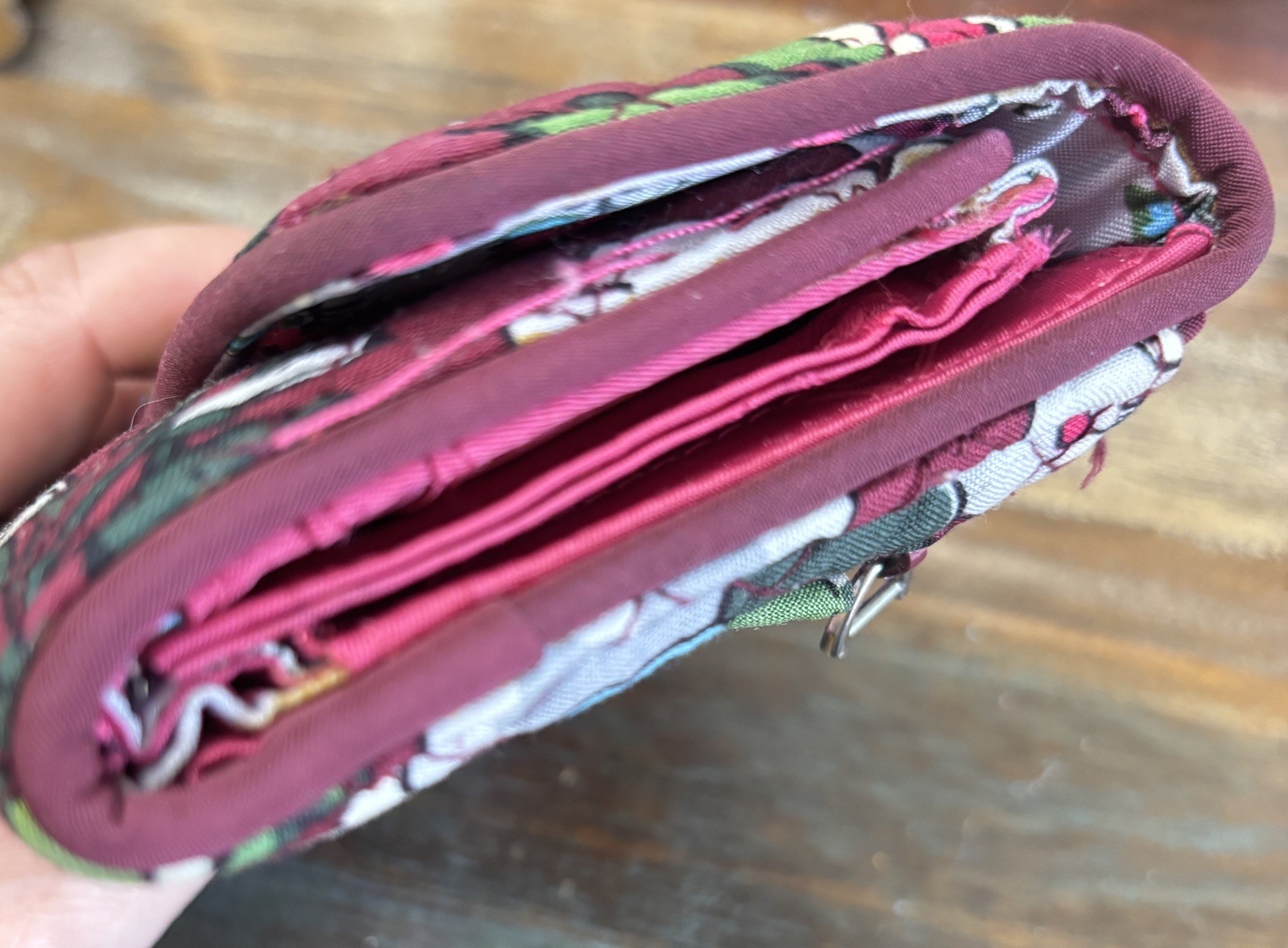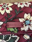 The Vera Bradley Bordeaux Blooms Riley Compact Quilted Fabric Wallet is a stylish and functional accessory for women. Made from cotton fabric with a floral pattern and Bordeaux Blooms character, this wallet features a trifold design with a quilted finish and logo accents. With a compact size of 5.5 x 4 inches, it includes credit card slots, a coin purse, and is designed for easy folding. The wallet is perfect for those who appreciate floral themes and want a practical yet fashionable item to carry their essentials. The fabric part of the zipper pull is missing from the back of the wallet. You can still open and close it with the metal part that is still there. See photos.