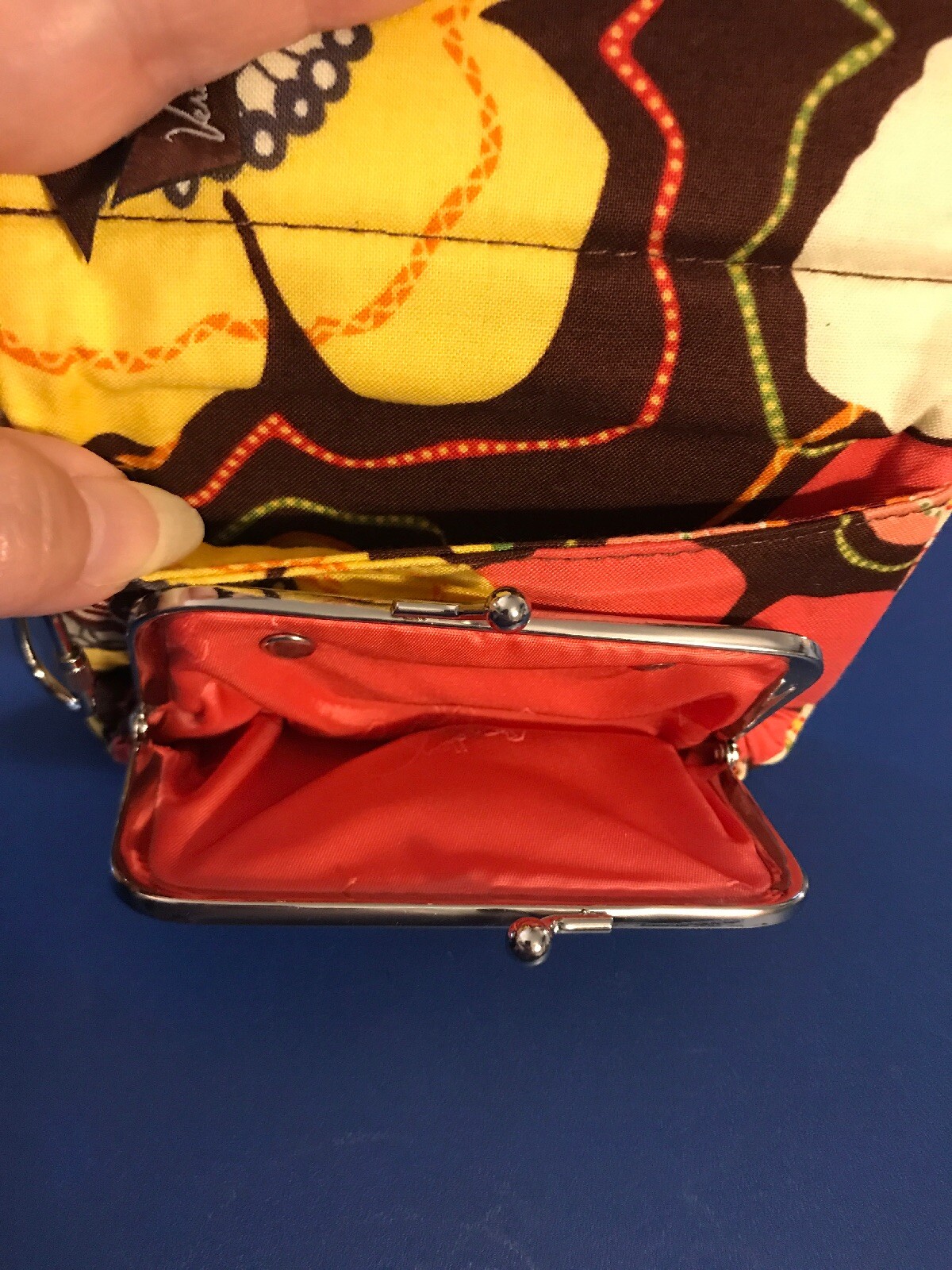 Wallet small Vera Bradley In Buttercup Keychain Preowened. Condition is Pre-owned. Great condition. Does have a small dirt place on back outside. May come out. See pixs carefully. Has snap closure with outside ID place. Inside has kisslock coin purse behind it is open pocket. Also one zipper pocket. Nice piece with one tini spot on back.