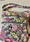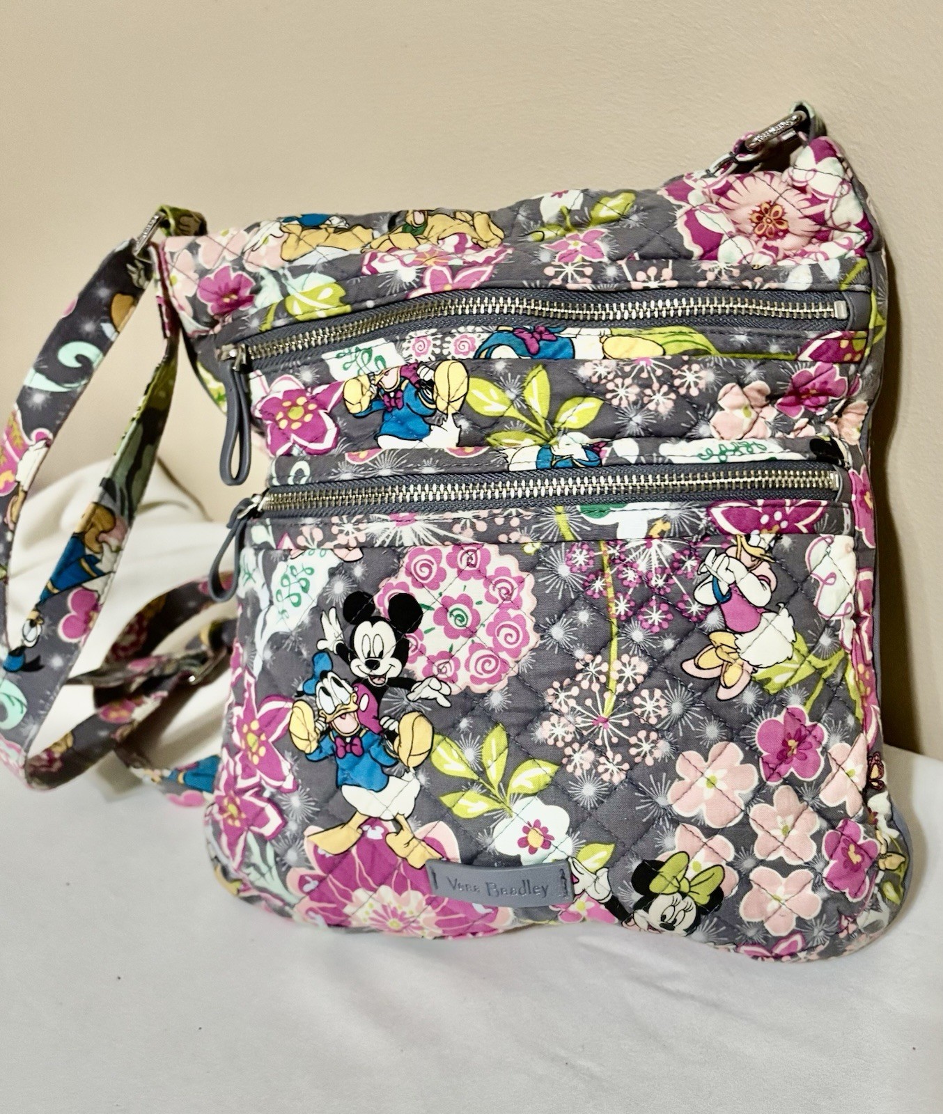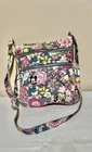 The Vera Bradley Disney Triple Zip Hipster Crossbody Bag in Grey and Pink is a stylish and practical accessory for women. Made of cotton with a quilted finish, this medium-sized bag features a floral pattern and silver hardware accents. The crossbody strap in multicolor adds a fun touch, while the zip closure ensures your belongings are secure. Perfect for carrying your essentials while on-the-go, this bag is sure to make a statement with its vibrant colors and playful design.