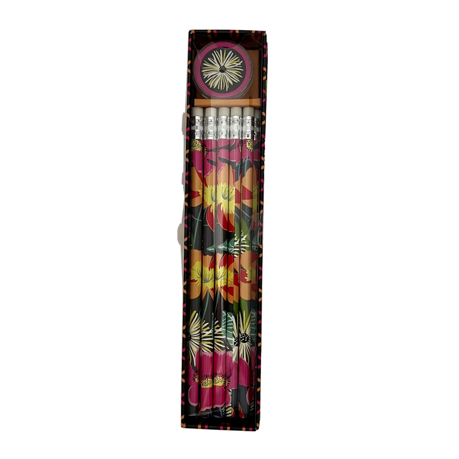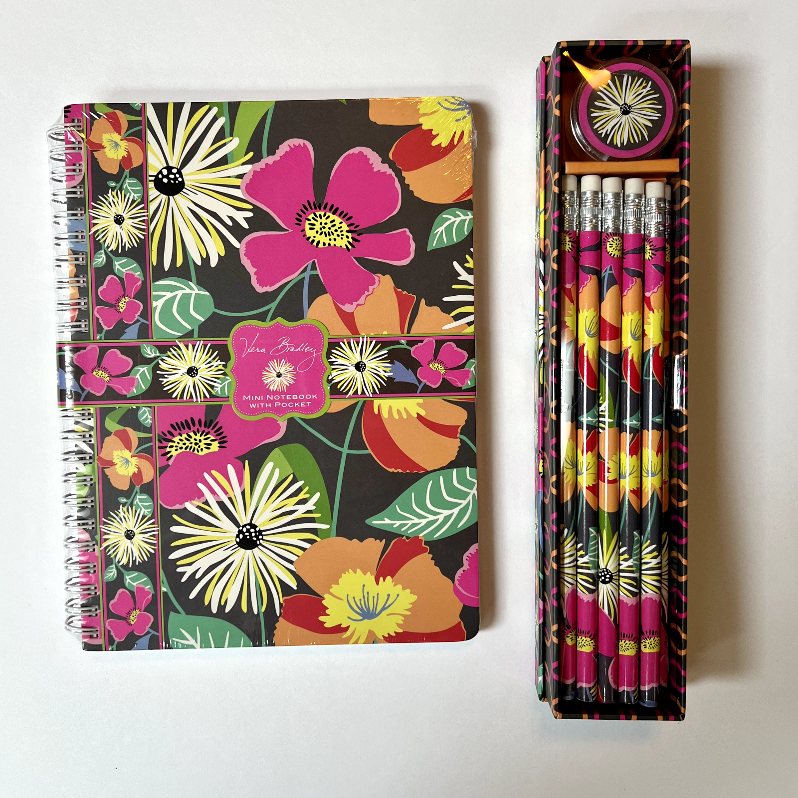 Vera Bradley Mini Notebook and Pencil Box Set Brand New in Original Packaging with tags ~ YOUR PURCHASE INCLUDES THESE 2 MATCHING ITEMS! ~ These are from the full line Vera Store and not from the Outlet. Beautiful Retired and Hard to Find. 1 VERA BRADLEY MINI NOTEBOOK WITH POCKET IN JAZZY BLOOMS Brand new and sealed in package This mini notebook is perfect for lists and great ideas! Stash one at your desk and one in your bag and watch your organizational plans come together. Ruled pages with perforated edges Double-sided pocket page following front cover to store loose notes Hardcover notebook features a JAZZY BLOOMS print Spiral bound Lined notebook measures 6.25 inches (15.9 cm) wide x 8.25 inches (20.9 cm) tall Perfect for shopping lists or to use as a journal ~ AND ~ 1 VERA BRADLEY PENCIL BOX SET IN JAZZY BLOOMS Brand new in original packaging which is a beautiful box Box has decorative lid Ten # 2 decorated pencils Decorative pencil sharpener If you need to take notes or even jot down a quick reminder, you might as well do it in style with these decorated pencils from Vera Bradley! Perfect for gifting to a Vera Bradley fan who prefers their pencils to look as good as their handbag! Or Perfect for school in any backpack! I want you to be happy with your purchase so I accept returns but any items returned must be in the same brand new condition with tags attached and free of any odors. I am not affiliated with Vera Bradley in any way> I just love to shop and love Vera. All of my items come from my very clean smoke free home.