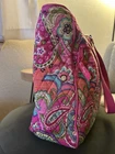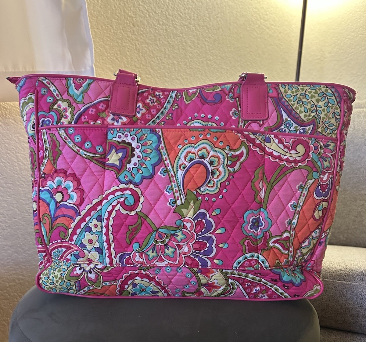 The Vera Bradley Quilted Floral Paisley Tote Bag in Coral Pink is a stylish and practical accessory for women. With a rectangular shape and a zip closure, this large tote features beautiful floral paisley quilted pattern in pink color with accents of pink hardware. It has double pink cotton handles for easy carrying and inner pockets for organization. Perfect for travel, casual outings, or workwear, this versatile bag from the Vera Bradley product line adds a touch of style to any outfit. Made with cotton exterior and lining, this tote is both fashionable and durable for everyday use. Thank you, GBC!