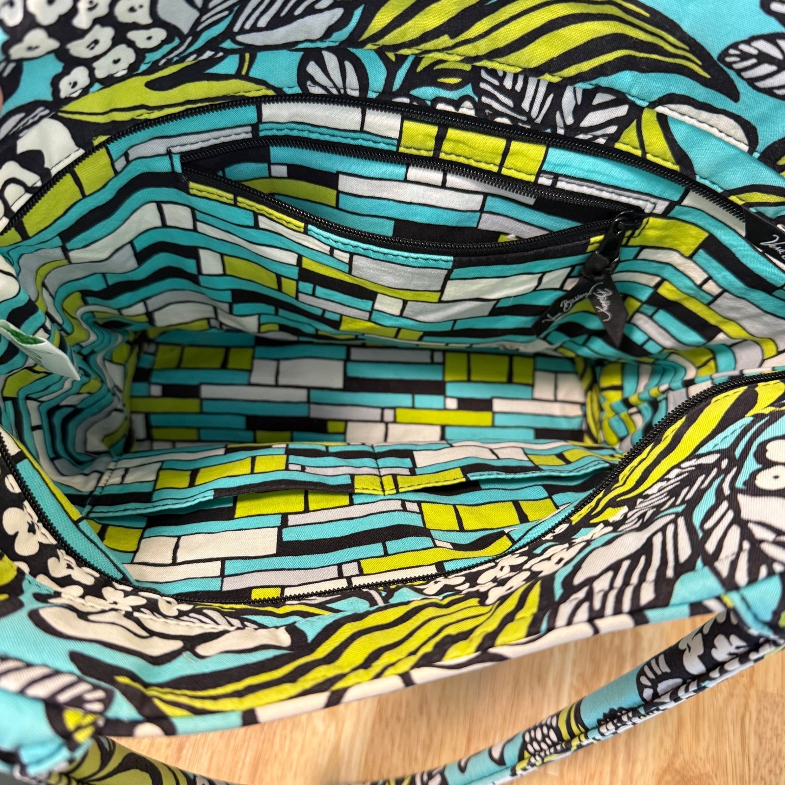 A vibrant Vera Bradley tote bag showcasing a lively floral pattern in turquoise green white and black. This quilted bag features a spacious main compartment with zippered and slip pockets for organization and comfortable shoulder straps. The interior lining boasts a geometric pattern. Measurements: • Width: 15 in • Handle Drop: 9 in Exterior Material: Cotton, Polyester Style: Tote Exterior Color: Green Department: Women Product Line: Vera Bradley Lining Color: Multicolor Lining Material: Cotton, Fabric Hardware Color: Black Pattern: Floral Closure: Zip Bag Width: 15 in Bag Height: 10 in Bag Depth: 6 in Theme: Flower, Nature Keywords: Vera Bradley tote, floral tote, turquoise bag, quilted handbag, shoulder bag, everyday bag, summer bag, travel bag, stylish tote, designer bag, patterned bag, canvas tote Item is preowned, effort has been made to ensure all flaws are displayed photos serve as additional description Sizing varies by manufacturer and time period, please see measurements.