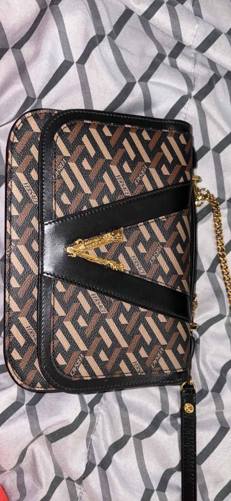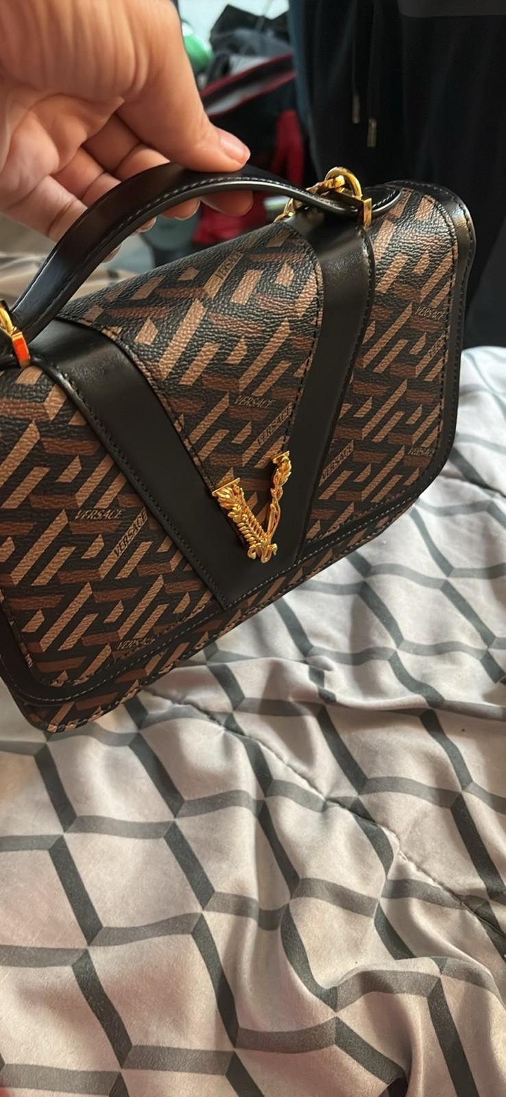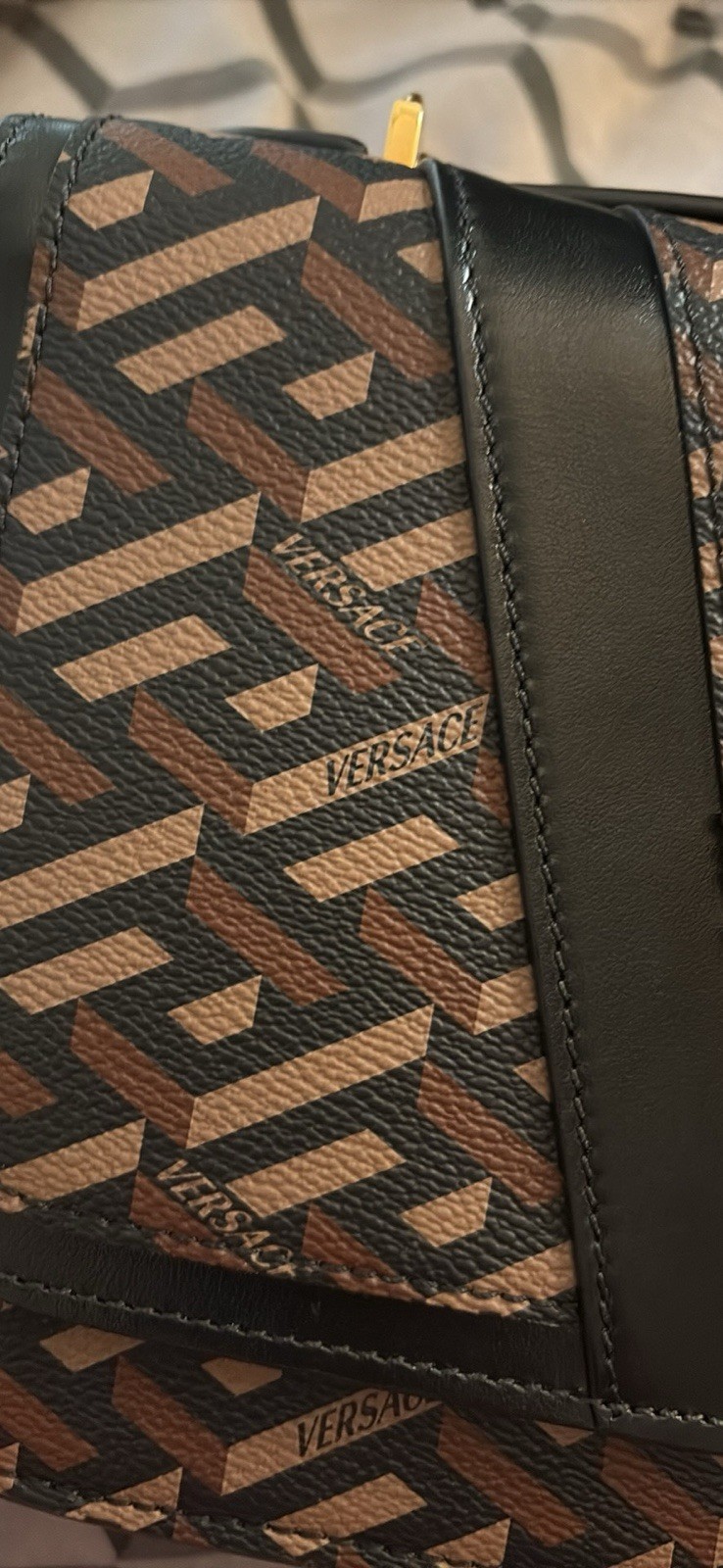 This Versace crossbody is a stunning statement piece! The Goyardine leather pattern and gold hardware give it a luxe, eye-catching look. The size is perfect for essentials, and the adjustable strap makes it super versatile. Comes with the dust bag—practically new! A must-have for any fashion lover who appreciates designer quality.