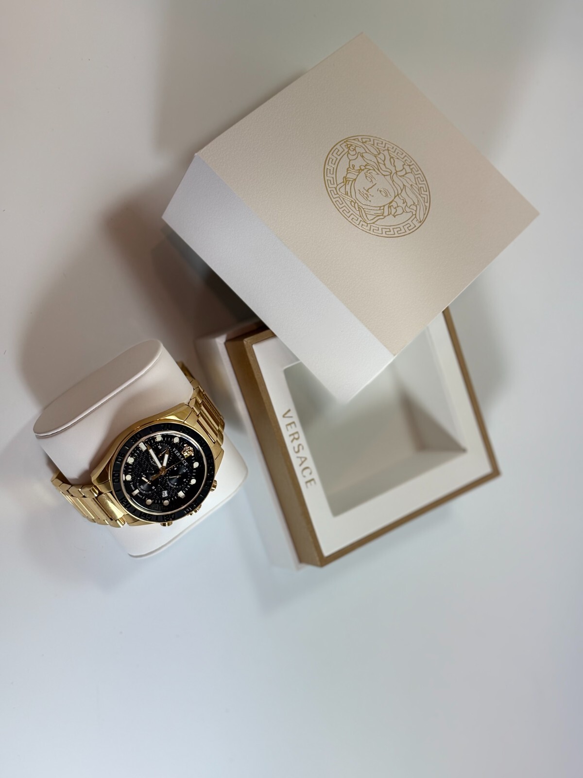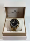 New Versace Men's VE6K00523 Greca Dome Chronograph Gold Swiss Made Watch Authentic Black Dial. Gold Stainless Steel band. 100% Authentic. Brand new with tags, box, papers and warranty cards. Fast and free shipping. Returns are accepted. Item must be in original conditions with ALL tags, box, papers and warranty cards included. Item will be carefully inspected upon re turn received before full refund will be made.