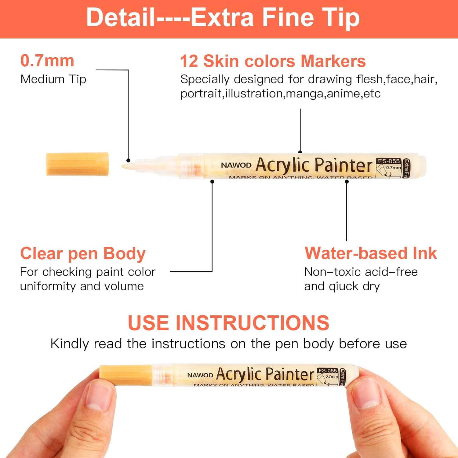 Store New Arrivals Add to Favorite View Feedback NAWOD Skin Tones Art Markers, Acrylic Paint Pens Set of 12 Skin Colors Paint Markers for Rocks Canvas Tiles Glass Ceramic Wood Sketch Portrait Manga Drawing Illustration Sketching, Extra Fine Tip Description Item model number SHENZHEN XMPEN FACTORY STATIONERY Item Weight 4 ounces Number of Items 12 Color 12 Skin Tones Material Type Plastic Brand NAWOD Line Size 0.7mm Manufacturer Part Number SHENZHEN XMPEN FACTORY STATIONERY Ink Color 12 Skin Tones Recommended Uses For Product Ceramic,Drawing,Illustration Manufacturer NAWODART007 Point Type Extra Fine Product Dimensions 5.9 x 0.6 x 0.6 inches Size 1 Count (Pack of 12) Premium Quality Acrylic Paint Pens: NAWOD Acrylic paint pens are made with high quality abundant oil ink, High purity color, strong covering force, waterproof, fade proof, non-bleeding. non-toxic, no odor, no strong smell, write smoothly and no leak. 12 Skin-tone Colors Marker Pens: This set has 12 skin portrait colors ranging from light to dark shades, specially designed for flesh & face drawing, bodies, hair, manga, portrait painting, illustration, sketching, and other artistic creations. Multi-Purpose: Enjoy creating art projects on a variety of surfaces like tiles, rocks, canvas, glass, wood, metal, fabric, porcelain, plastic, cardboard, papers, Halloween Pumpkin Painting, Christmas ornament, and much more for both smooth and porous surfaces; 0.7mm extra fine tips for fine line work, detailed DIY projects or art. Quick Drying & Non-toxic: Acrylic paint markers dry fast to help avoid blotches and smudging. Every marker is non-toxic with the safety standard ASTM D4236 & EN71-3 and safe for children from 3-year-old. Easy to Mix, No Stains: forget spots and uneven coloring. Our High-quality inks are seamlessly mixed to achieve beautiful coloring effects, even for newbies. In addition, your artwork will never fade or stain over time. Product Description HOW DO I USE IT? In order to get the best results, it is important that the following instructions are followed. 1. With cap on, shake well to mix paint. When you hear the ball rattle inside, you’ll know the paint is mixing. 2. Press the tip to release the air. Then press the tip several times vertically until the ink exudates. 3. Test on paper before use. Then enjoy painting on different surfaces. If the nib dries out, you can press it again. 4. Recommended to cover the pen cap in time when not in use to prevent it from drying out.Better protection of the tip to extend the service life. NOTE: 1. Different materials have different drying times and different coloring conditions. You can wait for a while after writing to ensure better drying.Let it dry for a day for permanent results. 2. For a permanent result on the glass, porcelain, and ceramics, projects should be baked. Suggest bake for 1 hour 350F(180C). 3. Sharp rubbing will cause loss of color, you can use the pen to make up for color again. 4. Pay attention to hand contact when writing. After staining, please clean your hands as soon as possible. ABOUT US We offer the best prices around on high quality products. Our E-store includes media such as books, movies, music and games while offering electronics, toys, sporting apparel, clothing, tools, general home, garden items and more. SHIPPING We are always working hard to ensure your package arrives as soon as possible. Please understand that some factors like weather, high postal traffic, and the performance of shipping companies are outside of our control. We offer free shipping to the lower 48 states and ship within 2 business days of payment, usually sooner. We do not accept P.O. Boxes. Please provide a physical address. RETURNS We offer a 30-Day Return Policy on items which you are not completely satisfied with. You have the option for a full-refund or an exchange of the item. No returns are available on items shipped outside of the USA. PAYMENT We accept PayPal. CONTACT US This page content is yet to come Please ad us to your favorite seller and visit again later Thank You