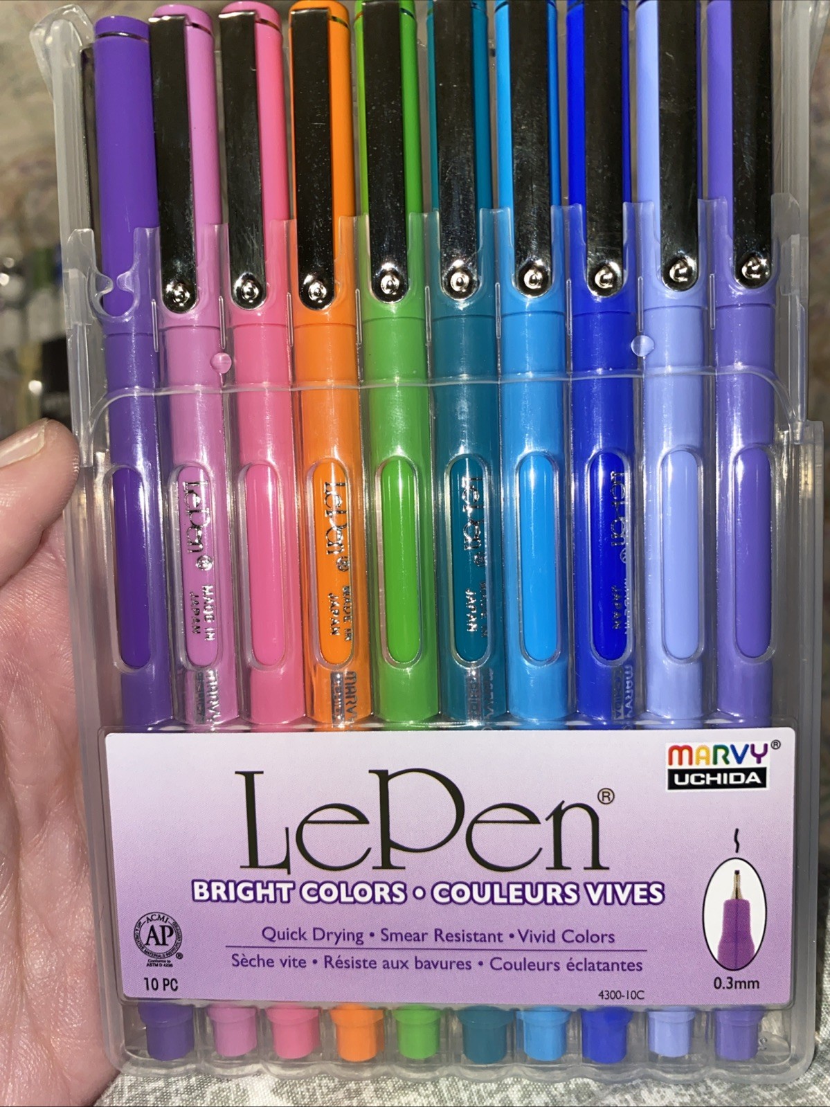 The LePen Markers are a set of 10 colored markers with a 0.3mm tip diameter. Featuring bright colors, these solid-colored markers are perfect for various writing and drawing tasks. Made by the brand LePen, these markers offer a high-quality writing experience without the need for a nib or ink cartridge. Great for crafting, coloring, and organizing, these markers are a versatile and vibrant addition to any creative or professional space.