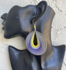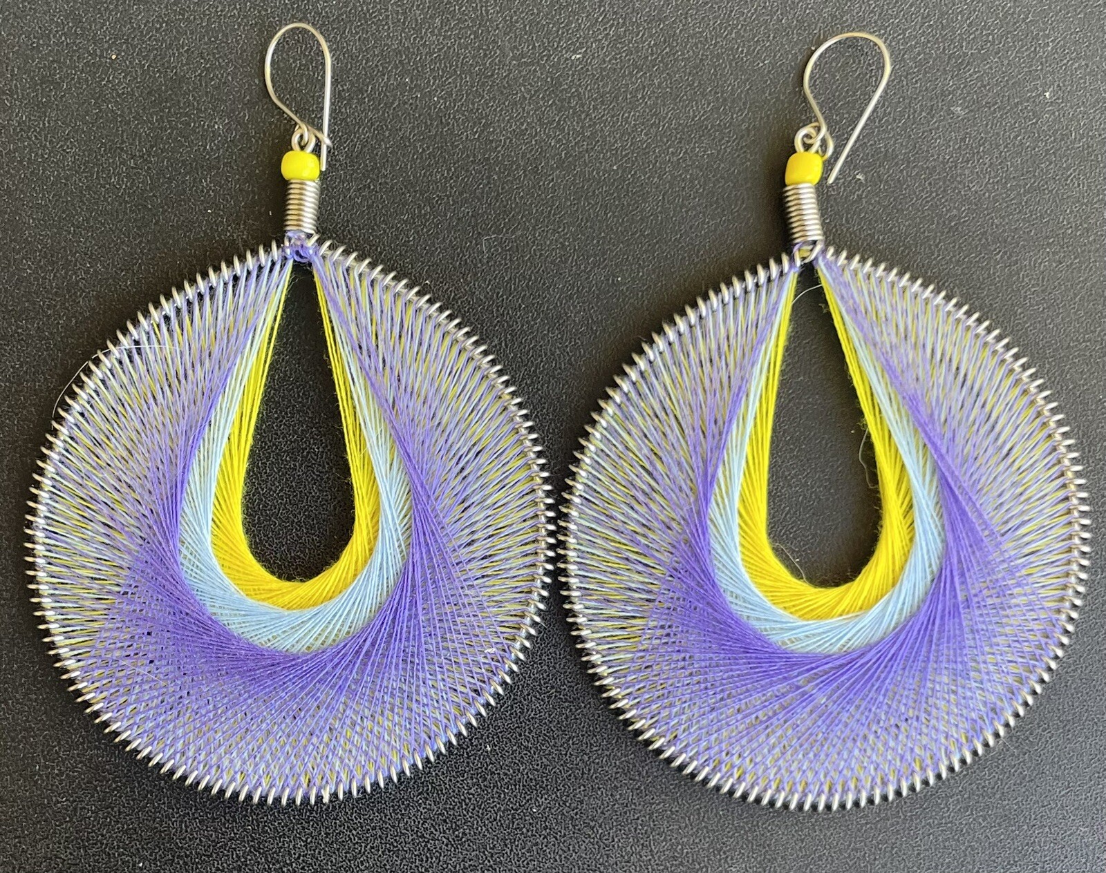This listing is for a pairs of large round shaped purple, yellow and blue thread earrings. The earrings are made with thread and alpaca silver. Alpaca silver is an alloy of zinc, iron, nickel and copper. It is extremely lightweight and will not rust or tarnish. The earrings were handmade in Peru and are approximately 3 1/2" long with the ear hooks included. You will receive the earrings pictured. The earrings are for pierced ears. 0-ea-th-ropuryblu-1